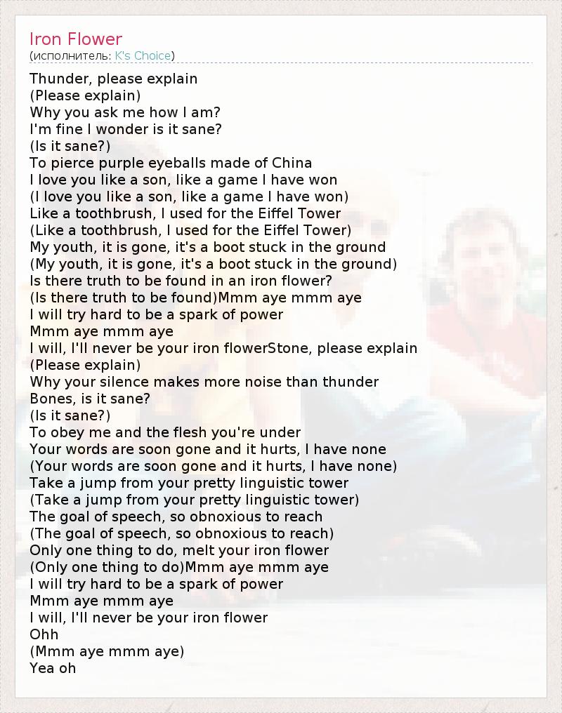 Thunder, please explain (Please explain) Why you ask me how I am? I'm fine I wonder is it sane? (Is it sane?) To pierce purple eyeballs made of China I love you like a son, like a game I have won (I love you like a son, like a game I have won) Like a toothbrush, I used for the Eiffel Tower (Like a toothbrush, I used for the Eiffel Tower) My youth, it is gone, it's a boot stuck in the ground (My youth, it is gone, it's a boot stuck in the ground) Is there truth to be found in an iron flower? (Is there truth to be found)Mmm aye mmm aye I will try hard to be a spark of power Mmm aye mmm aye I will, I'll never be your iron flowerStone, please explain (Please explain) Why your silence makes more noise than thunder Bones, is it sane? (Is it sane?) To obey me and the flesh you're under Your words are soon gone and it hurts, I have none (Your words are soon gone and it hurts, I have none) Take a jump from your pretty linguistic tower (Take a jump from your pretty linguistic tower) The goal of speech, so obnoxious to reach (The goal of speech, so obnoxious to reach) Only one thing to do, melt your iron flower (Only one thing to do)Mmm aye mmm aye I will try hard to be a spark of power Mmm aye mmm aye I will, I'll never be your iron flower Ohh (Mmm aye mmm aye) Yea oh