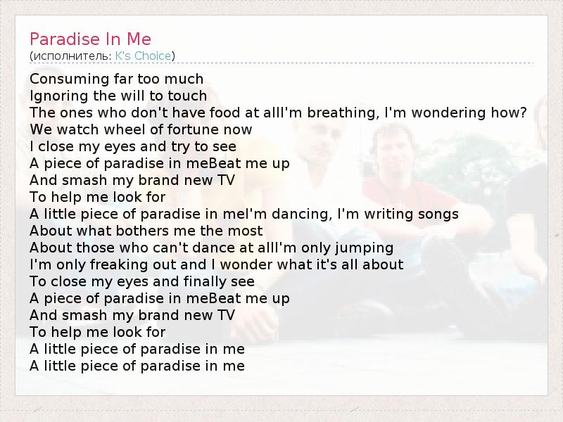 Consuming far too much Ignoring the will to touch The ones who don't have food at allI'm breathing, I'm wondering how? We watch wheel of fortune now I close my eyes and try to see A piece of paradise in meBeat me up And smash my brand new TV To help me look for A little piece of paradise in meI'm dancing, I'm writing songs About what bothers me the most About those who can't dance at allI'm only jumping I'm only freaking out and I wonder what it's all about To close my eyes and finally see A piece of paradise in meBeat me up And smash my brand new TV To help me look for A little piece of paradise in me A little piece of paradise in me