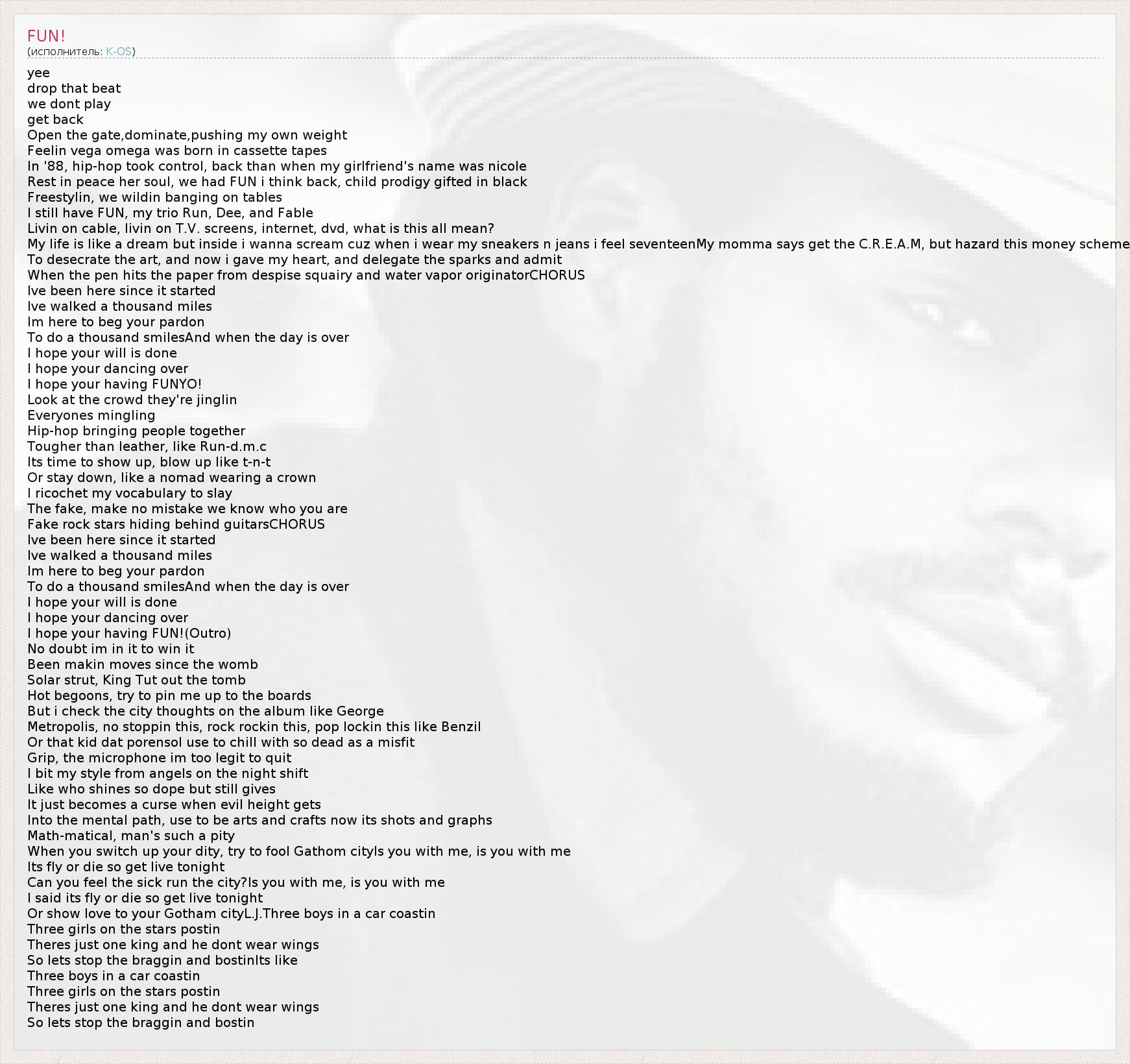 Это интересно:Потомок выходцев из Тринидада, взращенный заботливой семьей участников секты Свидетели Иеговы и осевший в Канаде – даже такого минимума информации достаточно, чтобы предположить в K-Os личность нерядовую. И предположение не будет ошибочным: эта персона заслуживает самого пристального внимания.Рэппер, певец и продюсер, работающий по принципу "И жнец, и швец и вообще п***ец" читает,... продолжение