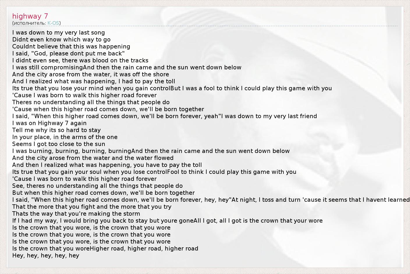 А как ты думаешь, о чем песня "highway 7" ?