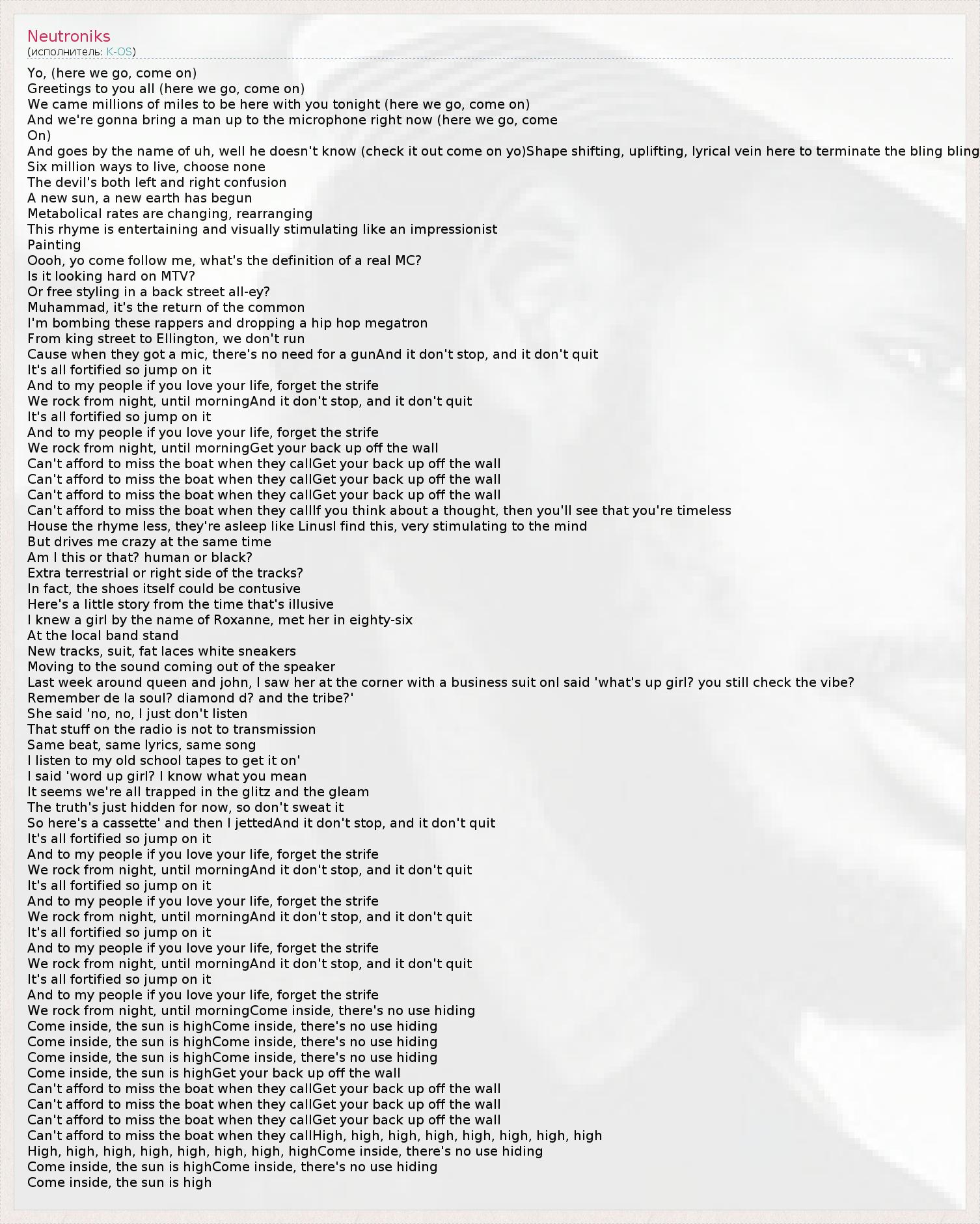 Yo, (here we go, come on) Greetings to you all (here we go, come on) We came millions of miles to be here with you tonight (here we go, come on) And we're gonna bring a man up to the microphone right now (here we go, come On) And goes by the name of uh, well he doesn't know (check it out come on yo)Shape shifting, uplifting, lyrical vein here to terminate the bling bling Six million ways to live, choose none The devil's both left and right confusion A new sun, a new earth has begun Metabolical rates are changing, rearranging This rhyme is entertaining and visually stimulating like an impressionist Painting Oooh, yo come follow me, what's the definition of a real MC? Is it looking hard on MTV? Or free styling in a back street all-ey? Muhammad, it's the return of the common I'm bombing these rappers and dropping a hip hop megatron From king street to Ellington, we don't run Cause when they got a mic, there's no need for a gunAnd it don't stop, and it don't quit It's all fortified so jump on it And to my people if you love your life, forget the strife We rock from night, until morningAnd it don't stop, and it don't quit It's all fortified so jump on it And to my people if you love your life, forget the strife We rock from night, until morningGet your back up off the wall Can't afford to miss the boat when they callGet your back up off the wall Can't afford to miss the boat when they callGet your back up off the wall Can't afford to miss the boat when they callGet your back up off the wall Can't afford to miss the boat when they callIf you think about a thought, then you'll see that you're timeless House the rhyme less, they're asleep like LinusI find this, very stimulating to the mind But drives me crazy at the same time Am I this or that? human or black? Extra terrestrial or right side of the tracks? In fact, the shoes itself could be contusive Here's a little story from the time that's illusive I knew a girl by the name of Roxanne, met her in eighty-six At the local band stand New tracks, suit, fat laces white sneakers Moving to the sound coming out of the speaker Last week around queen and john, I saw her at the corner with a business suit onI said 'what's up girl? you still check the vibe? Remember de la soul? diamond d? and the tribe?' She said 'no, no, I just don't listen That stuff on the radio is not to transmission Same beat, same lyrics, same song I listen to my old school tapes to get it on' I said 'word up girl? I know what you mean It seems we're all trapped in the glitz and the gleam The truth's just hidden for now, so don't sweat it So here's a cassette' and then I jettedAnd it don't stop, and it don't quit It's all fortified so jump on it And to my people if you love your life, forget the strife We rock from night, until morningAnd it don't stop, and it don't quit It's all fortified so jump on it And to my people if you love your life, forget the strife We rock from night, until morningAnd it don't stop, and it don't quit It's all fortified so jump on it And to my people if you love your life, forget the strife We rock from night, until morningAnd it don't stop, and it don't quit It's all fortified so jump on it And to my people if you love your life, forget the strife We rock from night, until morningCome inside, there's no use hiding Come inside, the sun is highCome inside, there's no use hiding Come inside, the sun is highCome inside, there's no use hiding Come inside, the sun is highCome inside, there's no use hiding Come inside, the sun is highGet your back up off the wall Can't afford to miss the boat when they callGet your back up off the wall Can't afford to miss the boat when they callGet your back up off the wall Can't afford to miss the boat when they callGet your back up off the wall Can't afford to miss the boat when they callHigh, high, high, high, high, high, high, high High, high, high, high, high, high, high, highCome inside, there's no use hiding Come inside, the sun is highCome inside, there's no use hiding Come inside, the sun is high