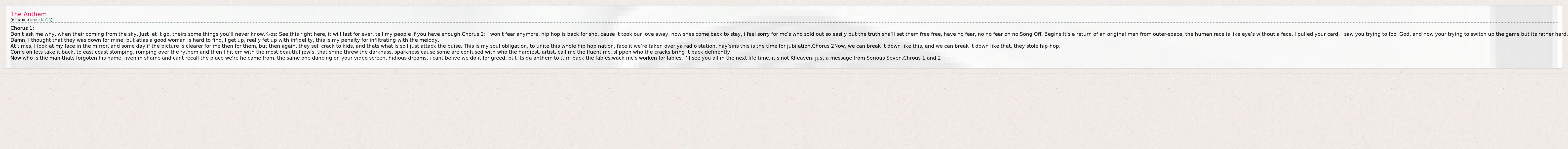Now who is the man thats forgoten his name, liven in shame and cant recall the place we're he came from, the same one dancing on your video screen, hidious dreams, i cant belive we do it for greed, but its da anthem to turn back the fables,wack mc's worken for lables. I'll see you all in the next life time, it's not Kheaven, just a message from Serious Seven.Chrous 1 and 2