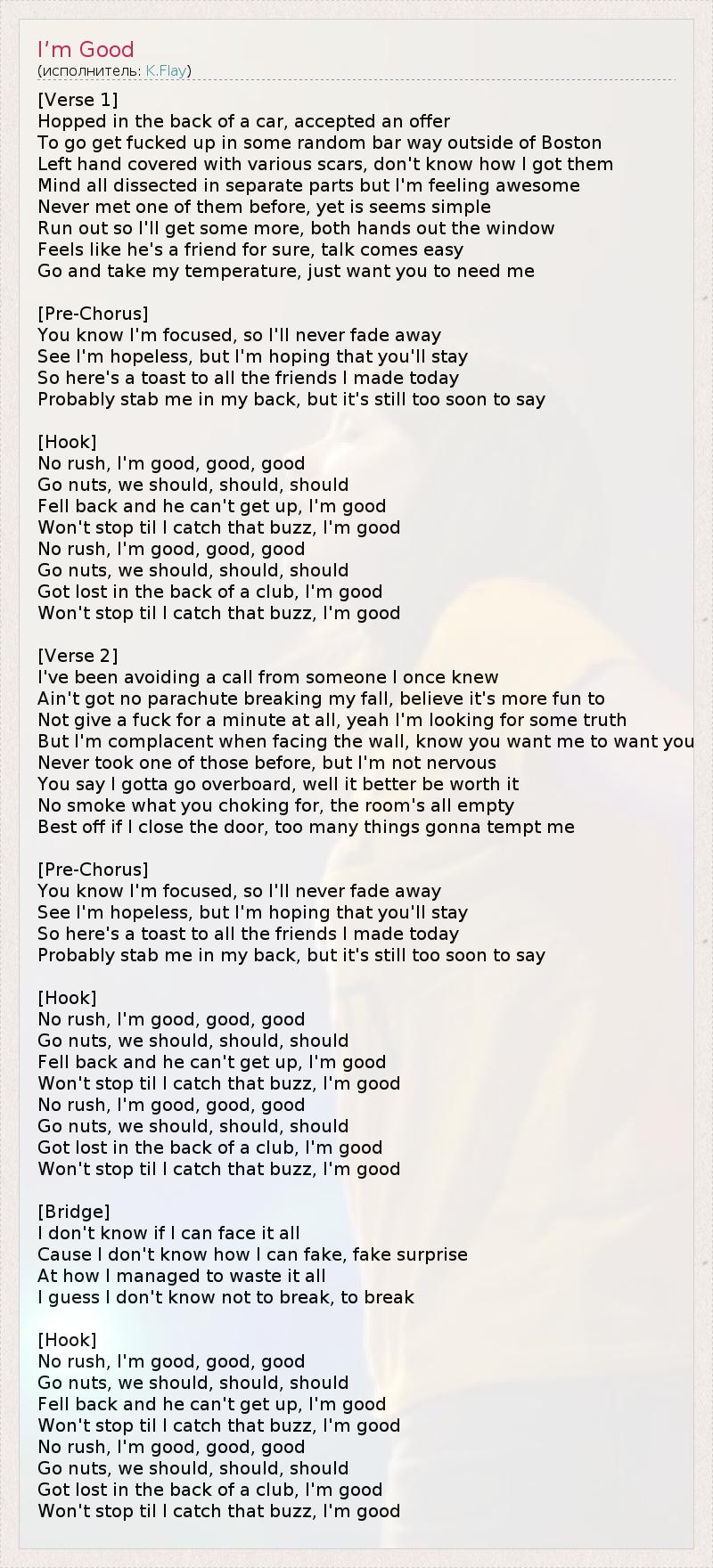 [Verse 1] Hopped in the back of a car, accepted an offer To go get fucked up in some random bar way outside of Boston Left hand covered with various scars, don't know how I got them Mind all dissected in separate parts but I'm feeling awesome Never met one of them before, yet is seems simple Run out so I'll get some more, both hands out the window Feels like he's a friend for sure, talk comes easy Go and take my temperature, just want you to need me [Pre-Chorus] You know I'm focused, so I'll never fade away See I'm hopeless, but I'm hoping that you'll stay So here's a toast to all the friends I made today Probably stab me in my back, but it's still too soon to say [Hook] No rush, I'm good, good, good Go nuts, we should, should, should Fell back and he can't get up, I'm good Won't stop til I catch that buzz, I'm good No rush, I'm good, good, good Go nuts, we should, should, should Got lost in the back of a club, I'm good Won't stop til I catch that buzz, I'm good [Verse 2] I've been avoiding a call from someone I once knew Ain't got no parachute breaking my fall, believe it's more fun to Not give a fuck for a minute at all, yeah I'm looking for some truth But I'm complacent when facing the wall, know you want me to want you Never took one of those before, but I'm not nervous You say I gotta go overboard, well it better be worth it No smoke what you choking for, the room's all empty Best off if I close the door, too many things gonna tempt me [Pre-Chorus] You know I'm focused, so I'll never fade away See I'm hopeless, but I'm hoping that you'll stay So here's a toast to all the friends I made today Probably stab me in my back, but it's still too soon to say [Hook] No rush, I'm good, good, good Go nuts, we should, should, should Fell back and he can't get up, I'm good Won't stop til I catch that buzz, I'm good No rush, I'm good, good, good Go nuts, we should, should, should Got lost in the back of a club, I'm good Won't stop til I catch that buzz, I'm good [Bridge] I don't know if I can face it all Cause I don't know how I can fake, fake surprise At how I managed to waste it all I guess I don't know not to break, to break [Hook] No rush, I'm good, good, good Go nuts, we should, should, should Fell back and he can't get up, I'm good Won't stop til I catch that buzz, I'm good No rush, I'm good, good, good Go nuts, we should, should, should Got lost in the back of a club, I'm good Won't stop til I catch that buzz, I'm good