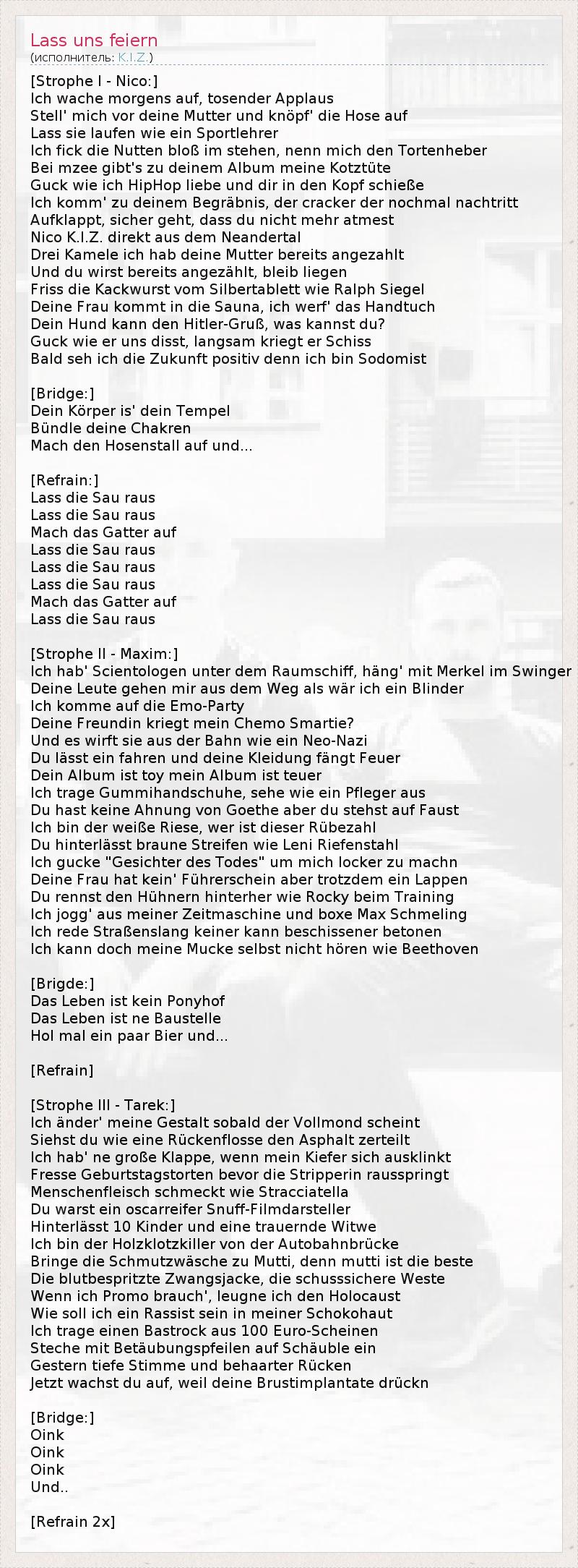 Это интересно:K.I.Z. это немецкая хип-хоп команда из Берлина. K.I.Z., по их собственному мнению, создали новый стиль немецкой рэп музыки, называя его "смесью панка и техно". Это прежде всего рэп батлы, как правило, заполненые большим количеством иронии и черного юмора. Группа состоит из четырех человек: Тарек, Максим, Нико (так известный как € 8000) и DJ Craft.Имеется несколько версий рассшифровки аббревиатуры... продолжение