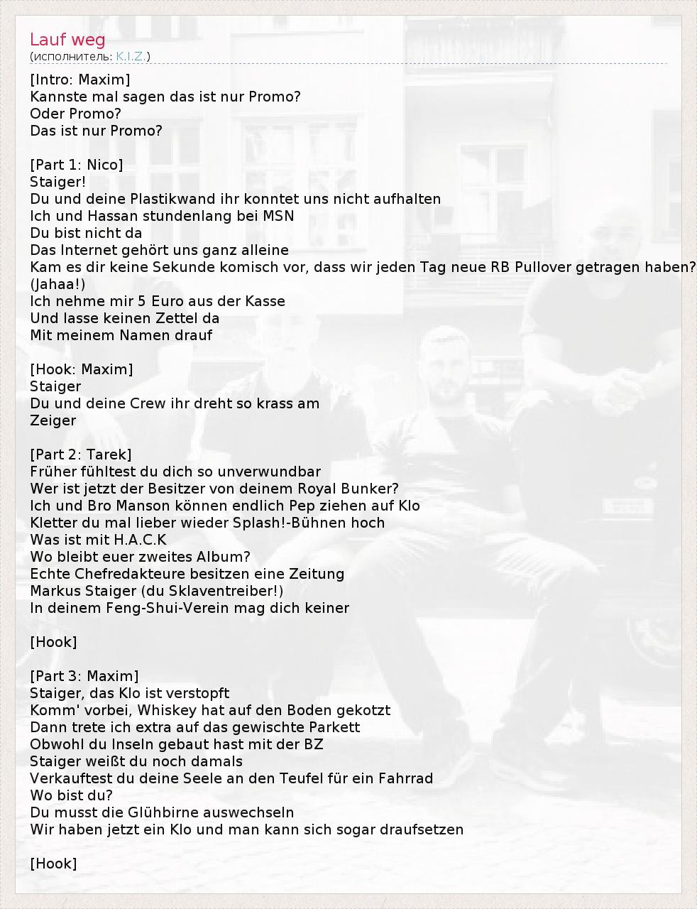 Это интересно:K.I.Z. это немецкая хип-хоп команда из Берлина. K.I.Z., по их собственному мнению, создали новый стиль немецкой рэп музыки, называя его "смесью панка и техно". Это прежде всего рэп батлы, как правило, заполненые большим количеством иронии и черного юмора. Группа состоит из четырех человек: Тарек, Максим, Нико (так известный как € 8000) и DJ Craft.Имеется несколько версий рассшифровки аббревиатуры... продолжение