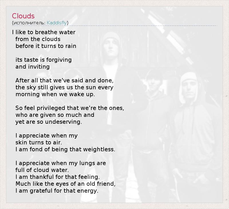 I like to breathe water from the clouds before it turns to rain its taste is forgiving and inviting After all that we've said and done, the sky still gives us the sun every morning when we wake up. So feel privileged that we're the ones, who are given so much and yet are so undeserving. I appreciate when my skin turns to air. I am fond of being that weightless. I appreciate when my lungs are full of cloud water. I am thankful for that feeling. Much like the eyes of an old friend, I am grateful for that energy.