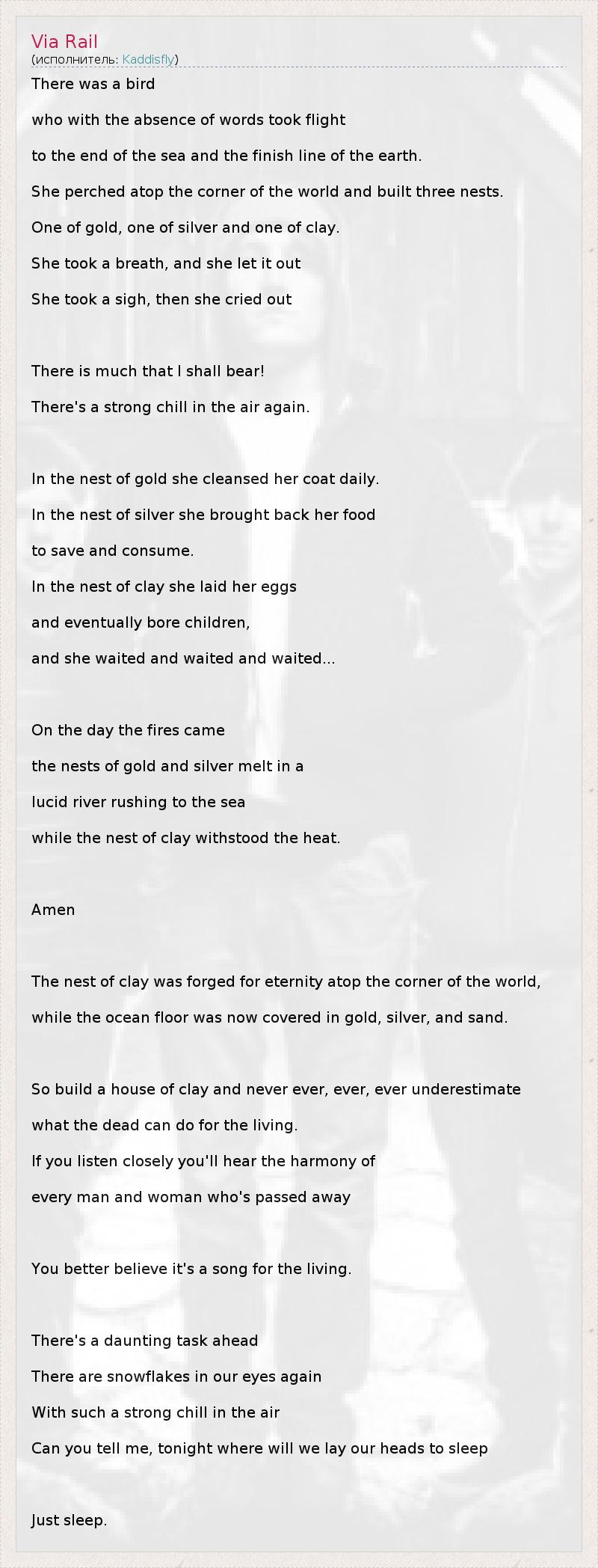 Это интересно:Kaddisfly это инди-рок группа из Портлэнда, США, образованная в 2000 году. Название произошло от маленького подобно моли насекомого Caddisfly. Kaddisfly не боятся экспрементировать с самыми различными музыкальными стилями, делая это очень гармонично и целостно. Они словно рисуют картины, только посредством музыкальных инструментов и голоса, создавая свое уникальное звучание и атмосферу…Состав:... продолжение