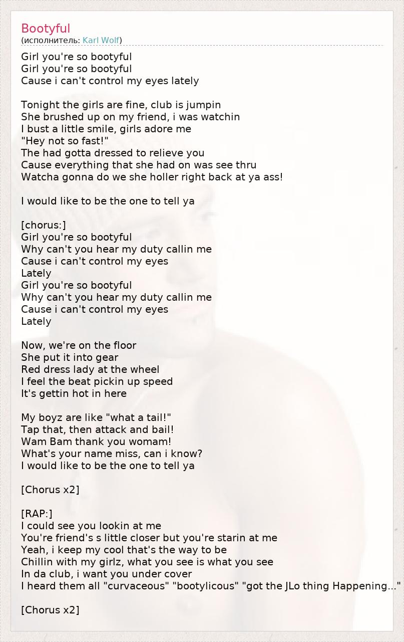 Girl you're so bootyful Girl you're so bootyful Cause i can't control my eyes lately Tonight the girls are fine, club is jumpin She brushed up on my friend, i was watchin I bust a little smile, girls adore me "Hey not so fast!" The had gotta dressed to relieve you Cause everything that she had on was see thru Watcha gonna do we she holler right back at ya ass! I would like to be the one to tell ya [chorus:] Girl you're so bootyful Why can't you hear my duty callin me Cause i can't control my eyes Lately Girl you're so bootyful Why can't you hear my duty callin me Cause i can't control my eyes Lately Now, we're on the floor She put it into gear Red dress lady at the wheel I feel the beat pickin up speed It's gettin hot in here My boyz are like "what a tail!" Tap that, then attack and bail! Wam Bam thank you womam! What's your name miss, can i know? I would like to be the one to tell ya [Chorus x2] [RAP:] I could see you lookin at me You're friend's s little closer but you're starin at me Yeah, i keep my cool that's the way to be Chillin with my girlz, what you see is what you see In da club, i want you under cover I heard them all "curvaceous" "bootylicous" "got the JLo thing Happening..." [Chorus x2]