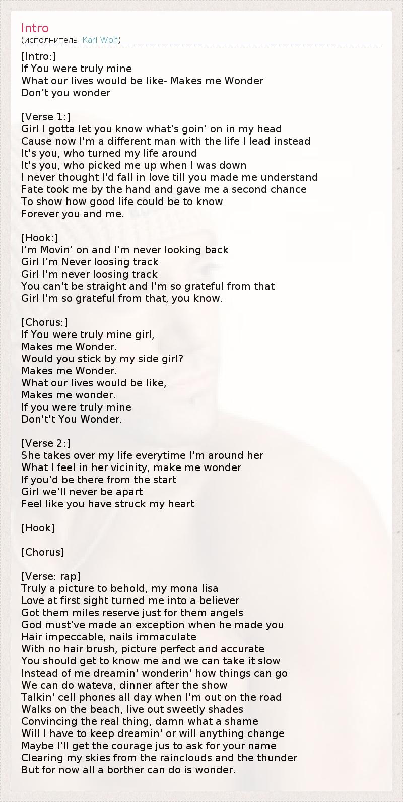 [Intro:] If You were truly mine What our lives would be like- Makes me Wonder Don't you wonder [Verse 1:] Girl I gotta let you know what's goin' on in my head Cause now I'm a different man with the life I lead instead It's you, who turned my life around It's you, who picked me up when I was down I never thought I'd fall in love till you made me understand Fate took me by the hand and gave me a second chance To show how good life could be to know Forever you and me. [Hook:] I'm Movin' on and I'm never looking back Girl I'm Never loosing track Girl I'm never loosing track You can't be straight and I'm so grateful from that Girl I'm so grateful from that, you know. [Chorus:] If You were truly mine girl, Makes me Wonder. Would you stick by my side girl? Makes me Wonder. What our lives would be like, Makes me wonder. If you were truly mine Don't't You Wonder. [Verse 2:] She takes over my life everytime I'm around her What I feel in her vicinity, make me wonder If you'd be there from the start Girl we'll never be apart Feel like you have struck my heart [Hook] [Chorus] [Verse: rap] Truly a picture to behold, my mona lisa Love at first sight turned me into a believer Got them miles reserve just for them angels God must've made an exception when he made you Hair impeccable, nails immaculate With no hair brush, picture perfect and accurate You should get to know me and we can take it slow Instead of me dreamin' wonderin' how things can go We can do wateva, dinner after the show Talkin' cell phones all day when I'm out on the road Walks on the beach, live out sweetly shades Convincing the real thing, damn what a shame Will I have to keep dreamin' or will anything change Maybe I'll get the courage jus to ask for your name Clearing my skies from the rainclouds and the thunder But for now all a borther can do is wonder.