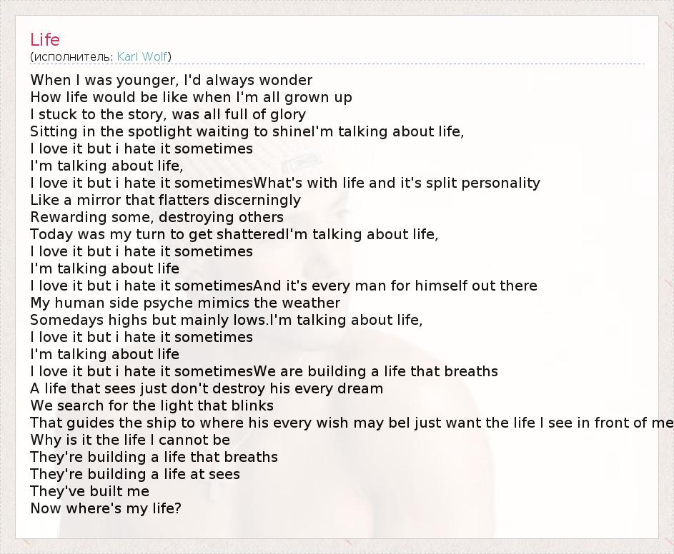 When I was younger, I'd always wonder How life would be like when I'm all grown up I stuck to the story, was all full of glory Sitting in the spotlight waiting to shineI'm talking about life, I love it but i hate it sometimes I'm talking about life, I love it but i hate it sometimesWhat's with life and it's split personality Like a mirror that flatters discerningly Rewarding some, destroying others Today was my turn to get shatteredI'm talking about life, I love it but i hate it sometimes I'm talking about life I love it but i hate it sometimesAnd it's every man for himself out there My human side psyche mimics the weather Somedays highs but mainly lows.I'm talking about life, I love it but i hate it sometimes I'm talking about life I love it but i hate it sometimesWe are building a life that breaths A life that sees just don't destroy his every dream We search for the light that blinks That guides the ship to where his every wish may beI just want the life I see in front of me Why is it the life I cannot be They're building a life that breaths They're building a life at sees They've built me Now where's my life?