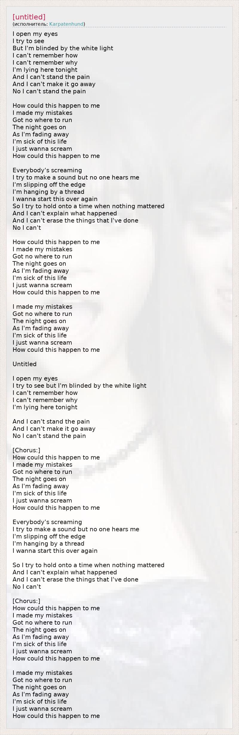 Глаза свои я открываю, Но чувствую, что видеть прекращаю. Во всем виновен этот свет И от него покоя нет. Сейчас я вспомнить не могу, Как ночью оказался я в аду. И эту боль уж не могу унять, Да и сейчас я не могу бежать. И эту боль я не смогу унять. Как со мной это случилось? Столько ошибок вдруг свершилось. Не куда теперь бежать, Ночь не станет помогать. Все я силы потерял, Так от жизни я устал. Я способен лишь кричать, Что случилось, хочу знать. Я слышу гул от голосов, Я сквозь него не слышу своих слов. На волоске, на грани, на пределе. Я так хочу начать сначала, В самом деле. О, как вернуть то время безмятежного покоя? Я не могу ведь описать, что же стряслось такое. И как стереть из памяти моей События давно минувших дней? Как со мной это случилось? Столько ошибок вдруг свершилось. Не куда теперь бежать, Ночь не станет помогать. Все я силы потерял, Так от жизни я устал. Я способен лишь кричать, Что случилось, хочу знать. Столько ошибок вдруг свершилось. Не куда теперь бежать, Ночь не станет помогать. Все я силы потерял, Так от жизни я устал. Я способен лишь кричать, Что случилось, хочу знать. Без названия (перевод лорд_Генри из Москвы) Я открываю глаза, Я пытаюсь посмотреть, но я ослеплен белым светом... Я не могу вспомнить, как, Я не могу вспомнить, почему Я лежу здесь сейчас... И я не могу вынести эту боль, Не могу прогнать ее, Нет, я не могу вынести эту боль... [Припев:] Как это могло случиться со мной? Я совершил свои ошибки, Бежать некуда. Ночь не прекращается,, И я постепенно исчезаю.... Я устал от этой жизни, Мне просто хочется кричать... Как это могло случиться со мной? Все кричат, Я пытаюсь произнести хоть звук, но меня никто не слышит.... Я скольжу по краю, Я держусь на волоске, Я хочу начать все с начала... И я пытаюсь держаться за времена, когда ничто не имело значения. Я не могу объяснить, что случилось, Не могу отменить того, что совершил, Нет, я не могу.... [Припев:] Как это могло случиться со мной? Я совершил свои ошибки, Бежать некуда. Ночь не прекращается,, И я постепенно исчезаю.... Я устал от этой жизни, Мне просто хочется кричать... Как это могло случиться со мной? Я совершил свои ошибки, Бежать некуда. Ночь не прекращается,, И я постепенно исчезаю.... Я устал от этой жизни, Мне просто хочется кричать... Как это могло случиться со мной?
