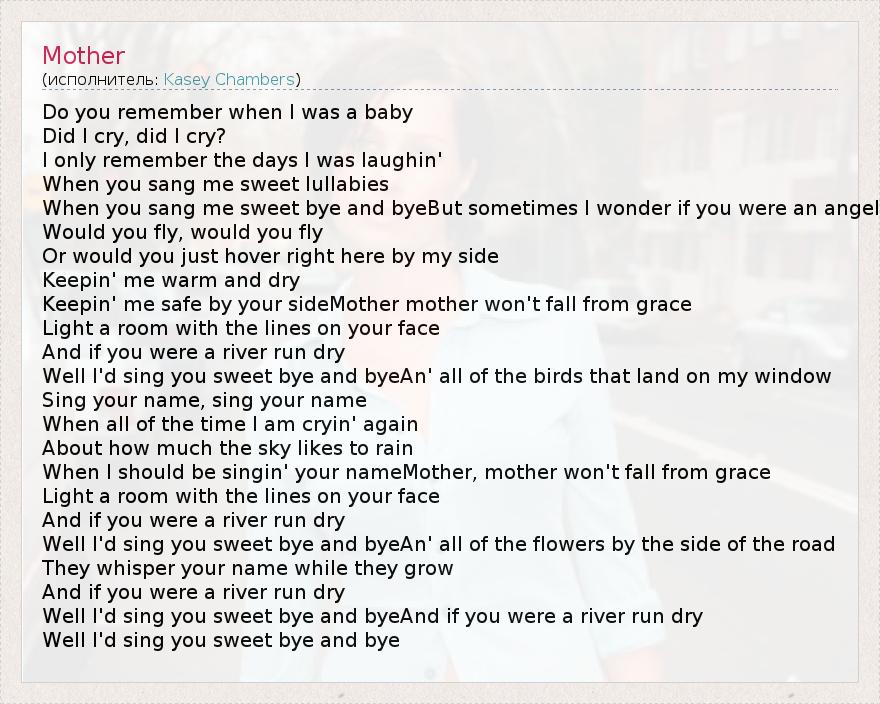 Do you remember when I was a baby Did I cry, did I cry? I only remember the days I was laughin' When you sang me sweet lullabies When you sang me sweet bye and byeBut sometimes I wonder if you were an angel Would you fly, would you fly Or would you just hover right here by my side Keepin' me warm and dry Keepin' me safe by your sideMother mother won't fall from grace Light a room with the lines on your face And if you were a river run dry Well I'd sing you sweet bye and byeAn' all of the birds that land on my window Sing your name, sing your name When all of the time I am cryin' again About how much the sky likes to rain When I should be singin' your nameMother, mother won't fall from grace Light a room with the lines on your face And if you were a river run dry Well I'd sing you sweet bye and byeAn' all of the flowers by the side of the road They whisper your name while they grow And if you were a river run dry Well I'd sing you sweet bye and byeAnd if you were a river run dry Well I'd sing you sweet bye and bye