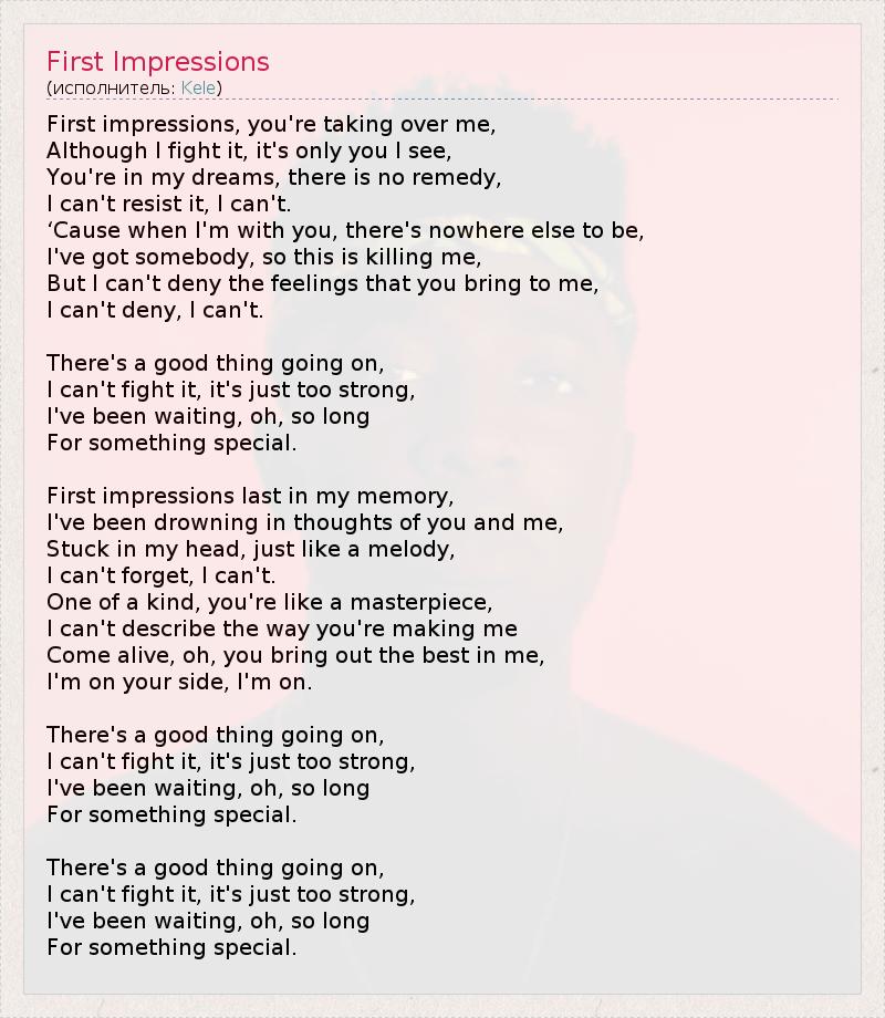 Первые впечатления — ты захватываешь меня, Хоть я и сопротивляюсь, но перед глазами лишь ты, Ты в моих снах, и лекарства нет, Не могу противиться, не могу. Потому что быть с тобой — самое главное, Но я не свободен, и это убивает меня, Но и отвергать чувства, которые ты вызываешь у меня Я не могу, не могу. Происходит нечто прекрасное, Я не могу бороться, оно слишком сильное, Я так долго ждал Чего-то особенного. Первые впечатления надолго останутся у меня в памяти, Я утопаю в мыслях о нас вместе, Они застряли у меня в голове, как навязчивая мелодия, Не могу забыть о них, не могу. Ты такой один, ты словно шедевр, Не могу описать, как ты пробуждаешь во мне Жизнь, о, ты показываешь лучшее во мне, Я на твоей стороне, на твоей. Происходит нечто прекрасное, Я не могу бороться, оно слишком сильное, Я так долго ждала Чего-то особенного. Происходит нечто прекрасное, Я не могу бороться, оно слишком сильное, Я так долго ждала Чего-то особенного.