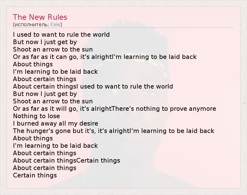 I used to want to rule the world But now I just get by Shoot an arrow to the sun Or as far as it can go, it's alrightI'm learning to be laid back About things I'm learning to be laid back About certain things About certain thingsI used to want to rule the world But now I just get by Shoot an arrow to the sun Or as far as it will go, it's alrightThere's nothing to prove anymore Nothing to lose I burned away all my desire The hunger's gone but it's, it's alrightI'm learning to be laid back About things I'm learning to be laid back About certain things About certain thingsCertain things About certain things Certain things