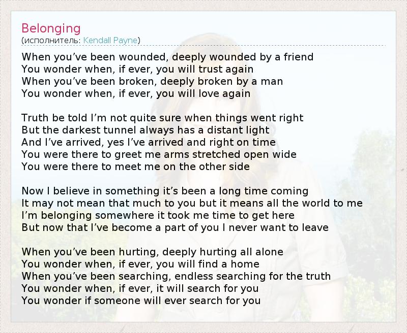 When you’ve been wounded, deeply wounded by a friend You wonder when, if ever, you will trust again When you’ve been broken, deeply broken by a man You wonder when, if ever, you will love again Truth be told I’m not quite sure when things went right But the darkest tunnel always has a distant light And I’ve arrived, yes I’ve arrived and right on time You were there to greet me arms stretched open wide You were there to meet me on the other side Now I believe in something it’s been a long time coming It may not mean that much to you but it means all the world to me I’m belonging somewhere it took me time to get here But now that I’ve become a part of you I never want to leave When you’ve been hurting, deeply hurting all alone You wonder when, if ever, you will find a home When you’ve been searching, endless searching for the truth You wonder when, if ever, it will search for you You wonder if someone will ever search for you