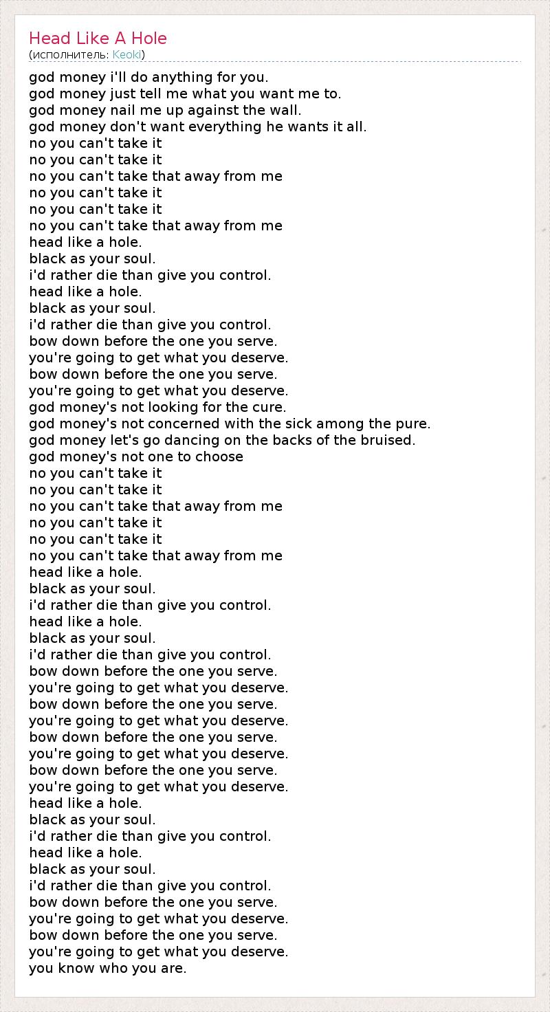 god money i'll do anything for you. god money just tell me what you want me to. god money nail me up against the wall. god money don't want everything he wants it all. no you can't take it no you can't take it no you can't take that away from me no you can't take it no you can't take it no you can't take that away from me head like a hole. black as your soul. i'd rather die than give you control. head like a hole. black as your soul. i'd rather die than give you control. bow down before the one you serve. you're going to get what you deserve. bow down before the one you serve. you're going to get what you deserve. god money's not looking for the cure. god money's not concerned with the sick among the pure. god money let's go dancing on the backs of the bruised. god money's not one to choose no you can't take it no you can't take it no you can't take that away from me no you can't take it no you can't take it no you can't take that away from me head like a hole. black as your soul. i'd rather die than give you control. head like a hole. black as your soul. i'd rather die than give you control. bow down before the one you serve. you're going to get what you deserve. bow down before the one you serve. you're going to get what you deserve. bow down before the one you serve. you're going to get what you deserve. bow down before the one you serve. you're going to get what you deserve. head like a hole. black as your soul. i'd rather die than give you control. head like a hole. black as your soul. i'd rather die than give you control. bow down before the one you serve. you're going to get what you deserve. bow down before the one you serve. you're going to get what you deserve. you know who you are.