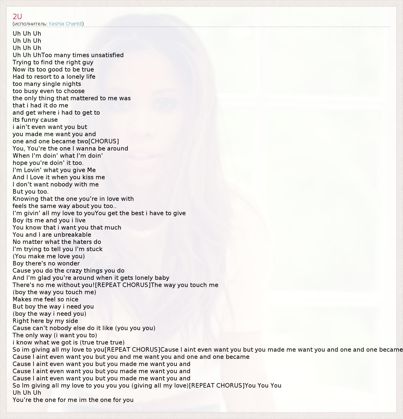 Uh Uh Uh Uh Uh Uh Uh Uh Uh Uh Uh UhToo many times unsatisfied Trying to find the right guy Now its too good to be true Had to resort to a lonely life too many single nights too busy even to choose the only thing that mattered to me was that i had it do me and get where i had to get to its funny cause i ain't even want you but you made me want you and one and one became two[CHORUS] You, You're the one I wanna be around When I'm doin' what I'm doin' hope you're doin' it too. I'm Lovin' what you give Me And I Love it when you kiss me I don't want nobody with me But you too. Knowing that the one you're in love with feels the same way about you too.. I'm givin' all my love to youYou get the best i have to give Boy its me and you i live You know that i want you that much You and I are unbreakable No matter what the haters do I'm trying to tell you I'm stuck (You make me love you) Boy there's no wonder Cause you do the crazy things you do And I'm glad you're around when it gets lonely baby There's no me without you![REPEAT CHORUS]The way you touch me (boy the way you touch me) Makes me feel so nice But boy the way i need you (boy the way i need you) Right here by my side Cause can't nobody else do it like (you you you) The only way (i want you to) i know what we got is (true true true) So im giving all my love to you[REPEAT CHORUS]Cause I aint even want you but you made me want you and one and one became Cause I aint even want you but you and me want you and one and one became Cause I aint even want you but you made me want you and Cause I aint even want you but you made me want you and Cause I aint even want you but you made me want you and So Im giving all my love to you you you (giving all my love)[REPEAT CHORUS]You You You Uh Uh Uh You're the one for me im the one for you