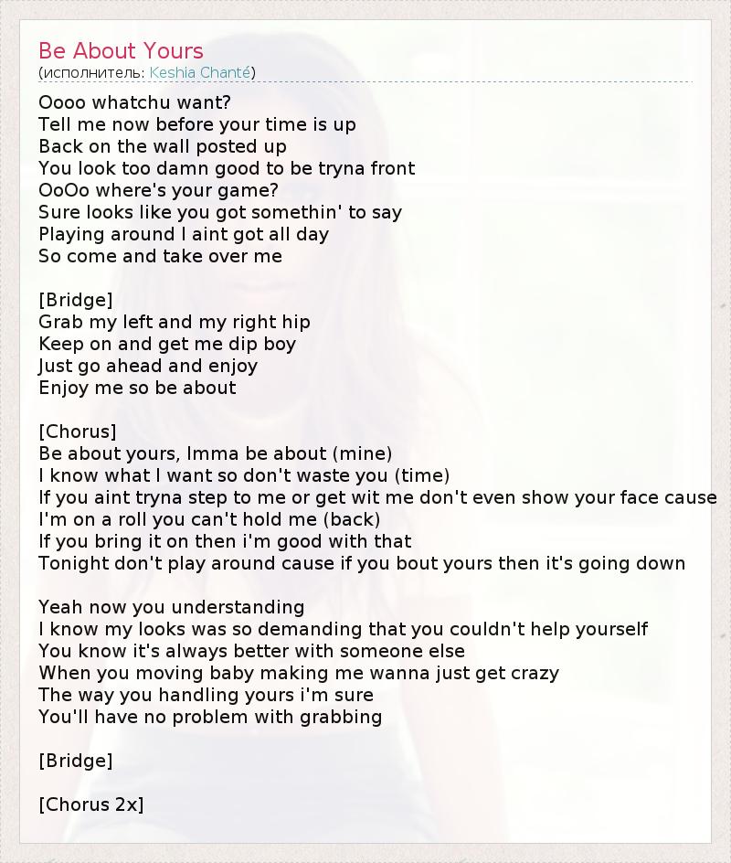 Oooo whatchu want? Tell me now before your time is up Back on the wall posted up You look too damn good to be tryna front OoOo where's your game? Sure looks like you got somethin' to say Playing around I aint got all day So come and take over me [Bridge] Grab my left and my right hip Keep on and get me dip boy Just go ahead and enjoy Enjoy me so be about [Chorus] Be about yours, Imma be about (mine) I know what I want so don't waste you (time) If you aint tryna step to me or get wit me don't even show your face cause I'm on a roll you can't hold me (back) If you bring it on then i'm good with that Tonight don't play around cause if you bout yours then it's going down Yeah now you understanding I know my looks was so demanding that you couldn't help yourself You know it's always better with someone else When you moving baby making me wanna just get crazy The way you handling yours i'm sure You'll have no problem with grabbing [Bridge] [Chorus 2x]