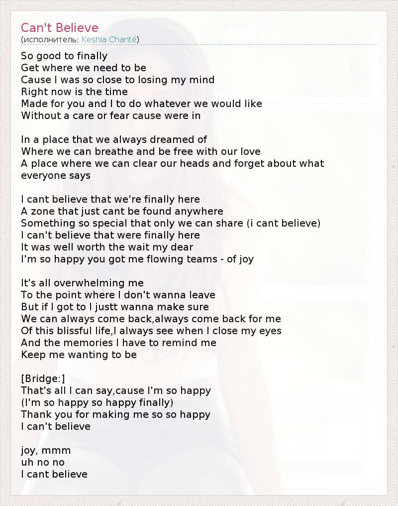 So good to finally Get where we need to be Cause I was so close to losing my mind Right now is the time Made for you and I to do whatever we would like Without a care or fear cause were in In a place that we always dreamed of Where we can breathe and be free with our love A place where we can clear our heads and forget about what everyone says I cant believe that we're finally here A zone that just cant be found anywhere Something so special that only we can share (i cant believe) I can't believe that were finally here It was well worth the wait my dear I'm so happy you got me flowing teams - of joy It's all overwhelming me To the point where I don't wanna leave But if I got to I justt wanna make sure We can always come back,always come back for me Of this blissful life,I always see when I close my eyes And the memories I have to remind me Keep me wanting to be [Bridge:] That's all I can say,cause I'm so happy (I'm so happy so happy finally) Thank you for making me so so happy I can't believe joy, mmm uh no no I cant believe