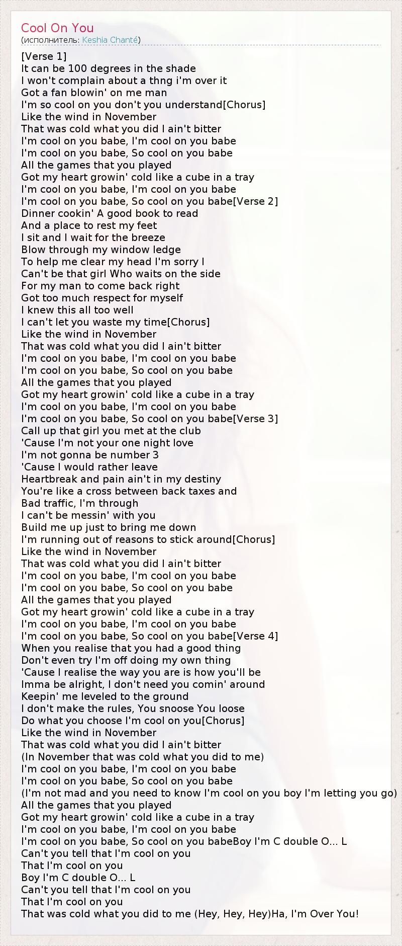 [Verse 1] It can be 100 degrees in the shade I won't complain about a thng i'm over it Got a fan blowin' on me man I'm so cool on you don't you understand[Chorus] Like the wind in November That was cold what you did I ain't bitter I'm cool on you babe, I'm cool on you babe I'm cool on you babe, So cool on you babe All the games that you played Got my heart growin' cold like a cube in a tray I'm cool on you babe, I'm cool on you babe I'm cool on you babe, So cool on you babe[Verse 2] Dinner cookin' A good book to read And a place to rest my feet I sit and I wait for the breeze Blow through my window ledge To help me clear my head I'm sorry I Can't be that girl Who waits on the side For my man to come back right Got too much respect for myself I knew this all too well I can't let you waste my time[Chorus] Like the wind in November That was cold what you did I ain't bitter I'm cool on you babe, I'm cool on you babe I'm cool on you babe, So cool on you babe All the games that you played Got my heart growin' cold like a cube in a tray I'm cool on you babe, I'm cool on you babe I'm cool on you babe, So cool on you babe[Verse 3] Call up that girl you met at the club 'Cause I'm not your one night love I'm not gonna be number 3 'Cause I would rather leave Heartbreak and pain ain't in my destiny You're like a cross between back taxes and Bad traffic, I'm through I can't be messin' with you Build me up just to bring me down I'm running out of reasons to stick around[Chorus] Like the wind in November That was cold what you did I ain't bitter I'm cool on you babe, I'm cool on you babe I'm cool on you babe, So cool on you babe All the games that you played Got my heart growin' cold like a cube in a tray I'm cool on you babe, I'm cool on you babe I'm cool on you babe, So cool on you babe[Verse 4] When you realise that you had a good thing Don't even try I'm off doing my own thing 'Cause I realise the way you are is how you'll be Imma be alright, I don't need you comin' around Keepin' me leveled to the ground I don't make the rules, You snoose You loose Do what you choose I'm cool on you[Chorus] Like the wind in November That was cold what you did I ain't bitter (In November that was cold what you did to me) I'm cool on you babe, I'm cool on you babe I'm cool on you babe, So cool on you babe (I'm not mad and you need to know I'm cool on you boy I'm letting you go) All the games that you played Got my heart growin' cold like a cube in a tray I'm cool on you babe, I'm cool on you babe I'm cool on you babe, So cool on you babeBoy I'm C double O... L Can't you tell that I'm cool on you That I'm cool on you Boy I'm C double O... L Can't you tell that I'm cool on you That I'm cool on you That was cold what you did to me (Hey, Hey, Hey)Ha, I'm Over You!