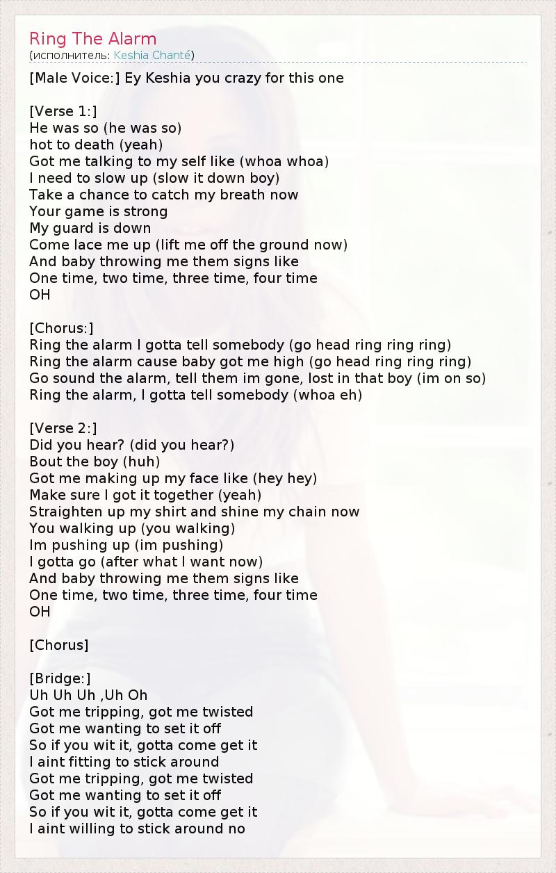 [Male Voice:] Ey Keshia you crazy for this one [Verse 1:] He was so (he was so) hot to death (yeah) Got me talking to my self like (whoa whoa) I need to slow up (slow it down boy) Take a chance to catch my breath now Your game is strong My guard is down Come lace me up (lift me off the ground now) And baby throwing me them signs like One time, two time, three time, four time OH [Chorus:] Ring the alarm I gotta tell somebody (go head ring ring ring) Ring the alarm cause baby got me high (go head ring ring ring) Go sound the alarm, tell them im gone, lost in that boy (im on so) Ring the alarm, I gotta tell somebody (whoa eh) [Verse 2:] Did you hear? (did you hear?) Bout the boy (huh) Got me making up my face like (hey hey) Make sure I got it together (yeah) Straighten up my shirt and shine my chain now You walking up (you walking) Im pushing up (im pushing) I gotta go (after what I want now) And baby throwing me them signs like One time, two time, three time, four time OH [Chorus] [Bridge:] Uh Uh Uh ,Uh Oh Got me tripping, got me twisted Got me wanting to set it off So if you wit it, gotta come get it I aint fitting to stick around Got me tripping, got me twisted Got me wanting to set it off So if you wit it, gotta come get it I aint willing to stick around no