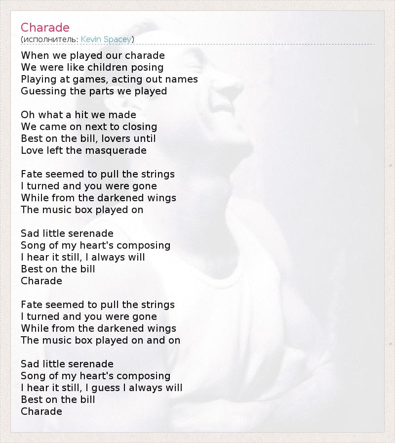 When we played our charade We were like children posing Playing at games, acting out names Guessing the parts we played Oh what a hit we made We came on next to closing Best on the bill, lovers until Love left the masquerade Fate seemed to pull the strings I turned and you were gone While from the darkened wings The music box played on Sad little serenade Song of my heart's composing I hear it still, I always will Best on the bill Charade Fate seemed to pull the strings I turned and you were gone While from the darkened wings The music box played on and on Sad little serenade Song of my heart's composing I hear it still, I guess I always will Best on the bill Charade