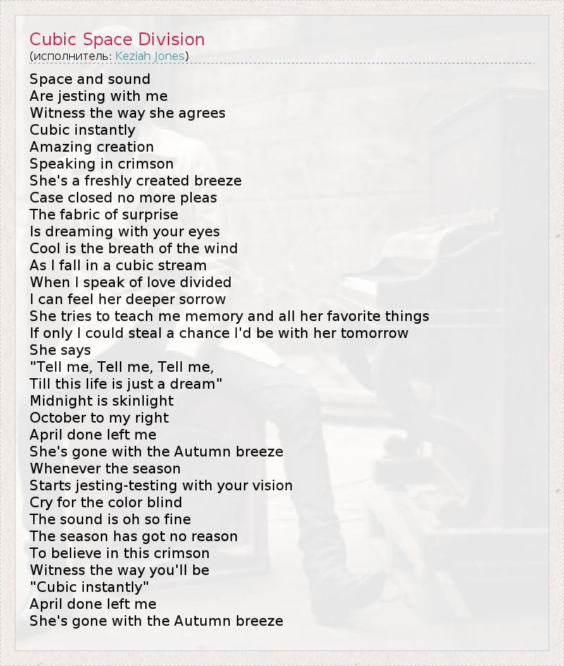 Space and sound Are jesting with me Witness the way she agrees Cubic instantly Amazing creation Speaking in crimson She's a freshly created breeze Case closed no more pleas The fabric of surprise Is dreaming with your eyes Cool is the breath of the wind As I fall in a cubic stream When I speak of love divided I can feel her deeper sorrow She tries to teach me memory and all her favorite things If only I could steal a chance I'd be with her tomorrow She says "Tell me, Tell me, Tell me, Till this life is just a dream" Midnight is skinlight October to my right April done left me She's gone with the Autumn breeze Whenever the season Starts jesting-testing with your vision Cry for the color blind The sound is oh so fine The season has got no reason To believe in this crimson Witness the way you'll be "Cubic instantly" April done left me She's gone with the Autumn breeze