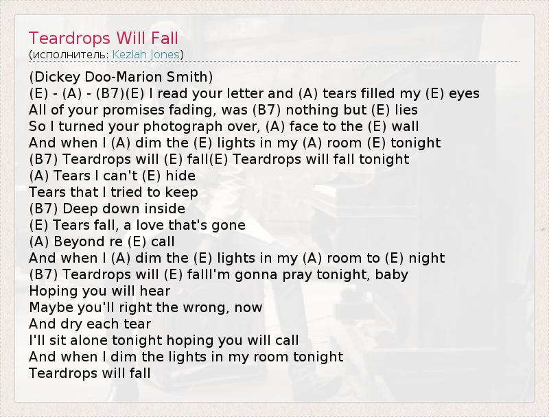 (Dickey Doo-Marion Smith) (E) - (A) - (B7)(E) I read your letter and (A) tears filled my (E) eyes All of your promises fading, was (B7) nothing but (E) lies So I turned your photograph over, (A) face to the (E) wall And when I (A) dim the (E) lights in my (A) room (E) tonight (B7) Teardrops will (E) fall(E) Teardrops will fall tonight (A) Tears I can't (E) hide Tears that I tried to keep (B7) Deep down inside (E) Tears fall, a love that's gone (A) Beyond re (E) call And when I (A) dim the (E) lights in my (A) room to (E) night (B7) Teardrops will (E) fallI'm gonna pray tonight, baby Hoping you will hear Maybe you'll right the wrong, now And dry each tear I'll sit alone tonight hoping you will call And when I dim the lights in my room tonight Teardrops will fall