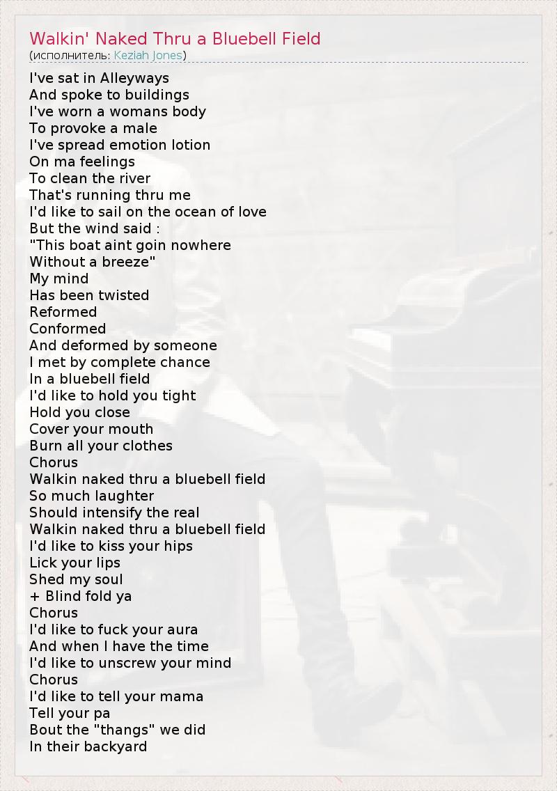 I've sat in Alleyways And spoke to buildings I've worn a womans body To provoke a male I've spread emotion lotion On ma feelings To clean the river That's running thru me I'd like to sail on the ocean of love But the wind said : "This boat aint goin nowhere Without a breeze" My mind Has been twisted Reformed Conformed And deformed by someone I met by complete chance In a bluebell field I'd like to hold you tight Hold you close Cover your mouth Burn all your clothes Chorus Walkin naked thru a bluebell field So much laughter Should intensify the real Walkin naked thru a bluebell field I'd like to kiss your hips Lick your lips Shed my soul + Blind fold ya Chorus I'd like to fuck your aura And when I have the time I'd like to unscrew your mind Chorus I'd like to tell your mama Tell your pa Bout the "thangs" we did In their backyard