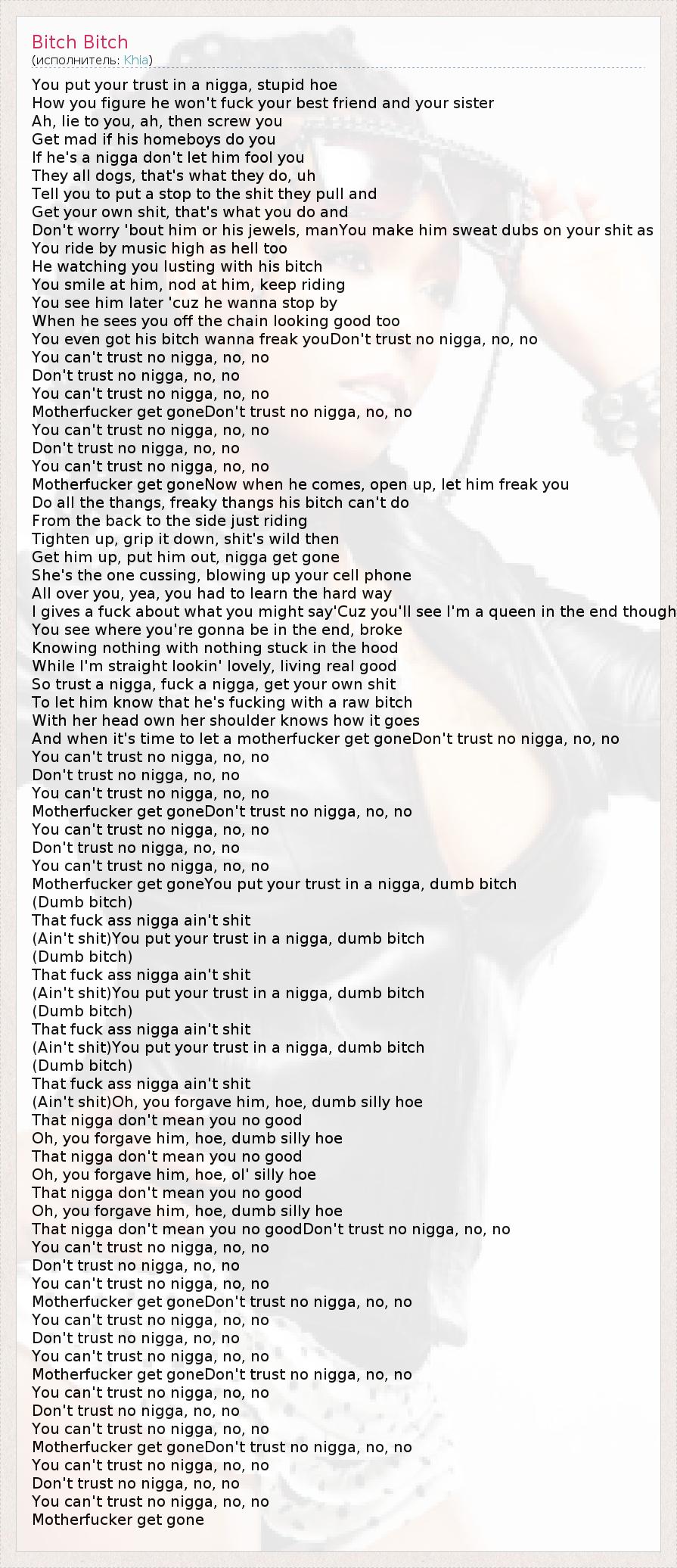 You put your trust in a nigga, stupid hoe How you figure he won't fuck your best friend and your sister Ah, lie to you, ah, then screw you Get mad if his homeboys do you If he's a nigga don't let him fool you They all dogs, that's what they do, uh Tell you to put a stop to the shit they pull and Get your own shit, that's what you do and Don't worry 'bout him or his jewels, manYou make him sweat dubs on your shit as You ride by music high as hell too He watching you lusting with his bitch You smile at him, nod at him, keep riding You see him later 'cuz he wanna stop by When he sees you off the chain looking good too You even got his bitch wanna freak youDon't trust no nigga, no, no You can't trust no nigga, no, no Don't trust no nigga, no, no You can't trust no nigga, no, no Motherfucker get goneDon't trust no nigga, no, no You can't trust no nigga, no, no Don't trust no nigga, no, no You can't trust no nigga, no, no Motherfucker get goneNow when he comes, open up, let him freak you Do all the thangs, freaky thangs his bitch can't do From the back to the side just riding Tighten up, grip it down, shit's wild then Get him up, put him out, nigga get gone She's the one cussing, blowing up your cell phone All over you, yea, you had to learn the hard way I gives a fuck about what you might say'Cuz you'll see I'm a queen in the end though You see where you're gonna be in the end, broke Knowing nothing with nothing stuck in the hood While I'm straight lookin' lovely, living real good So trust a nigga, fuck a nigga, get your own shit To let him know that he's fucking with a raw bitch With her head own her shoulder knows how it goes And when it's time to let a motherfucker get goneDon't trust no nigga, no, no You can't trust no nigga, no, no Don't trust no nigga, no, no You can't trust no nigga, no, no Motherfucker get goneDon't trust no nigga, no, no You can't trust no nigga, no, no Don't trust no nigga, no, no You can't trust no nigga, no, no Motherfucker get goneYou put your trust in a nigga, dumb bitch (Dumb bitch) That fuck ass nigga ain't shit (Ain't shit)You put your trust in a nigga, dumb bitch (Dumb bitch) That fuck ass nigga ain't shit (Ain't shit)You put your trust in a nigga, dumb bitch (Dumb bitch) That fuck ass nigga ain't shit (Ain't shit)You put your trust in a nigga, dumb bitch (Dumb bitch) That fuck ass nigga ain't shit (Ain't shit)Oh, you forgave him, hoe, dumb silly hoe That nigga don't mean you no good Oh, you forgave him, hoe, dumb silly hoe That nigga don't mean you no good Oh, you forgave him, hoe, ol' silly hoe That nigga don't mean you no good Oh, you forgave him, hoe, dumb silly hoe That nigga don't mean you no goodDon't trust no nigga, no, no You can't trust no nigga, no, no Don't trust no nigga, no, no You can't trust no nigga, no, no Motherfucker get goneDon't trust no nigga, no, no You can't trust no nigga, no, no Don't trust no nigga, no, no You can't trust no nigga, no, no Motherfucker get goneDon't trust no nigga, no, no You can't trust no nigga, no, no Don't trust no nigga, no, no You can't trust no nigga, no, no Motherfucker get goneDon't trust no nigga, no, no You can't trust no nigga, no, no Don't trust no nigga, no, no You can't trust no nigga, no, no Motherfucker get gone