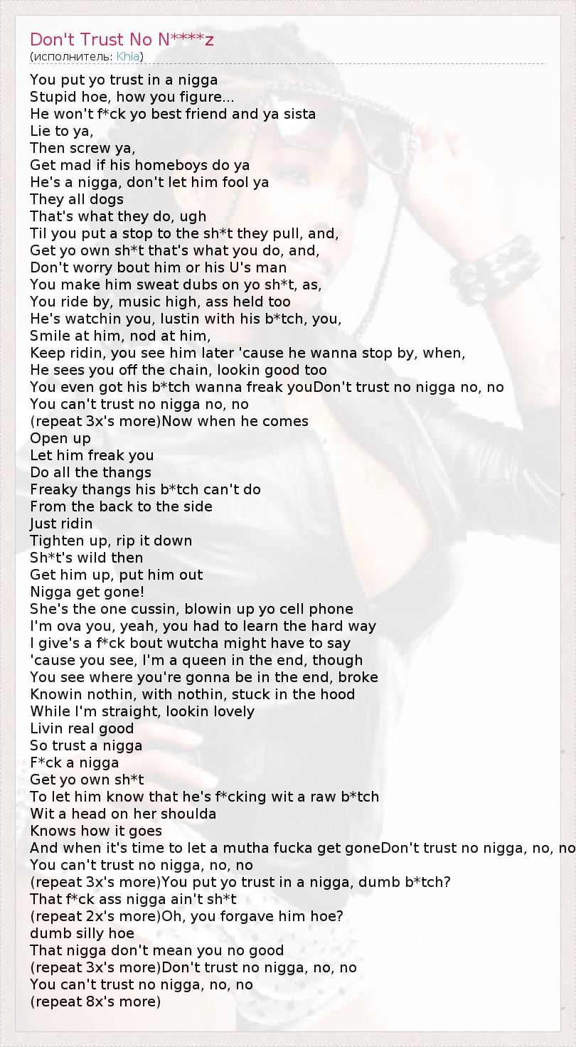 You put yo trust in a nigga Stupid hoe, how you figure... He won't f*ck yo best friend and ya sista Lie to ya, Then screw ya, Get mad if his homeboys do ya He's a nigga, don't let him fool ya They all dogs That's what they do, ugh Til you put a stop to the sh*t they pull, and, Get yo own sh*t that's what you do, and, Don't worry bout him or his U's man You make him sweat dubs on yo sh*t, as, You ride by, music high, ass held too He's watchin you, lustin with his b*tch, you, Smile at him, nod at him, Keep ridin, you see him later 'cause he wanna stop by, when, He sees you off the chain, lookin good too You even got his b*tch wanna freak youDon't trust no nigga no, no You can't trust no nigga no, no (repeat 3x's more)Now when he comes Open up Let him freak you Do all the thangs Freaky thangs his b*tch can't do From the back to the side Just ridin Tighten up, rip it down Sh*t's wild then Get him up, put him out Nigga get gone! She's the one cussin, blowin up yo cell phone I'm ova you, yeah, you had to learn the hard way I give's a f*ck bout wutcha might have to say 'cause you see, I'm a queen in the end, though You see where you're gonna be in the end, broke Knowin nothin, with nothin, stuck in the hood While I'm straight, lookin lovely Livin real good So trust a nigga F*ck a nigga Get yo own sh*t To let him know that he's f*cking wit a raw b*tch Wit a head on her shoulda Knows how it goes And when it's time to let a mutha fucka get goneDon't trust no nigga, no, no You can't trust no nigga, no, no (repeat 3x's more)You put yo trust in a nigga, dumb b*tch? That f*ck ass nigga ain't sh*t (repeat 2x's more)Oh, you forgave him hoe? dumb silly hoe That nigga don't mean you no good (repeat 3x's more)Don't trust no nigga, no, no You can't trust no nigga, no, no (repeat 8x's more)