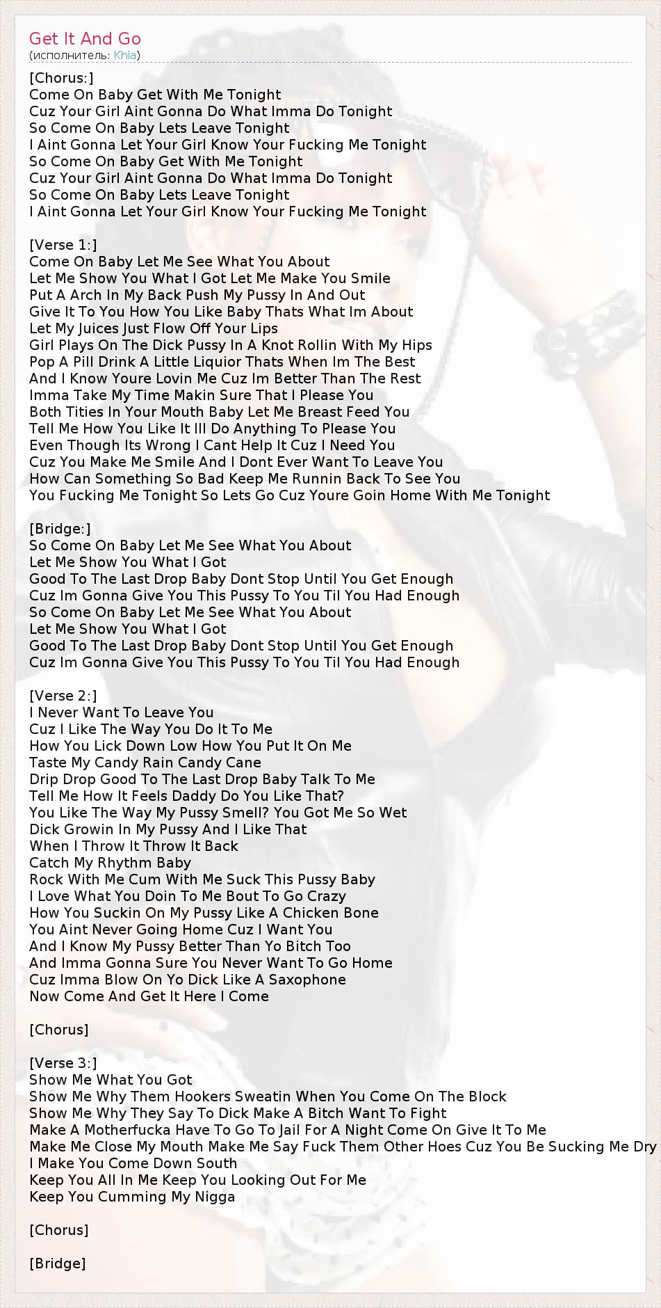 [Chorus:] Come On Baby Get With Me Tonight Cuz Your Girl Aint Gonna Do What Imma Do Tonight So Come On Baby Lets Leave Tonight I Aint Gonna Let Your Girl Know Your Fucking Me Tonight So Come On Baby Get With Me Tonight Cuz Your Girl Aint Gonna Do What Imma Do Tonight So Come On Baby Lets Leave Tonight I Aint Gonna Let Your Girl Know Your Fucking Me Tonight [Verse 1:] Come On Baby Let Me See What You About Let Me Show You What I Got Let Me Make You Smile Put A Arch In My Back Push My Pussy In And Out Give It To You How You Like Baby Thats What Im About Let My Juices Just Flow Off Your Lips Girl Plays On The Dick Pussy In A Knot Rollin With My Hips Pop A Pill Drink A Little Liquior Thats When Im The Best And I Know Youre Lovin Me Cuz Im Better Than The Rest Imma Take My Time Makin Sure That I Please You Both Tities In Your Mouth Baby Let Me Breast Feed You Tell Me How You Like It Ill Do Anything To Please You Even Though Its Wrong I Cant Help It Cuz I Need You Cuz You Make Me Smile And I Dont Ever Want To Leave You How Can Something So Bad Keep Me Runnin Back To See You You Fucking Me Tonight So Lets Go Cuz Youre Goin Home With Me Tonight [Bridge:] So Come On Baby Let Me See What You About Let Me Show You What I Got Good To The Last Drop Baby Dont Stop Until You Get Enough Cuz Im Gonna Give You This Pussy To You Til You Had Enough So Come On Baby Let Me See What You About Let Me Show You What I Got Good To The Last Drop Baby Dont Stop Until You Get Enough Cuz Im Gonna Give You This Pussy To You Til You Had Enough [Verse 2:] I Never Want To Leave You Cuz I Like The Way You Do It To Me How You Lick Down Low How You Put It On Me Taste My Candy Rain Candy Cane Drip Drop Good To The Last Drop Baby Talk To Me Tell Me How It Feels Daddy Do You Like That? You Like The Way My Pussy Smell? You Got Me So Wet Dick Growin In My Pussy And I Like That When I Throw It Throw It Back Catch My Rhythm Baby Rock With Me Cum With Me Suck This Pussy Baby I Love What You Doin To Me Bout To Go Crazy How You Suckin On My Pussy Like A Chicken Bone You Aint Never Going Home Cuz I Want You And I Know My Pussy Better Than Yo Bitch Too And Imma Gonna Sure You Never Want To Go Home Cuz Imma Blow On Yo Dick Like A Saxophone Now Come And Get It Here I Come [Chorus] [Verse 3:] Show Me What You Got Show Me Why Them Hookers Sweatin When You Come On The Block Show Me Why They Say To Dick Make A Bitch Want To Fight Make A Motherfucka Have To Go To Jail For A Night Come On Give It To Me Make Me Close My Mouth Make Me Say Fuck Them Other Hoes Cuz You Be Sucking Me Dry I Make You Come Down South Keep You All In Me Keep You Looking Out For Me Keep You Cumming My Nigga [Chorus] [Bridge]