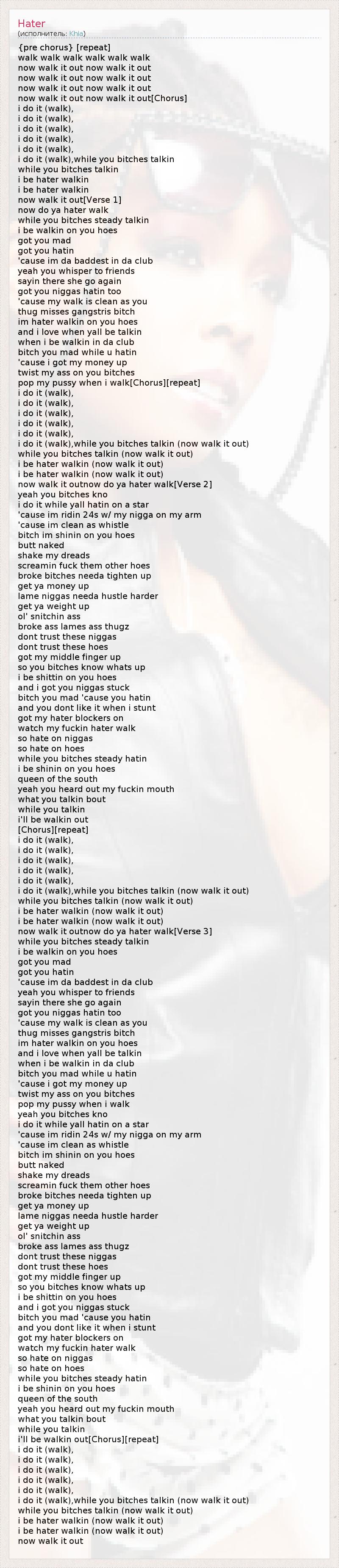 Это интересно:Khia Chambers (рожд. Khia Shamone Finch, род. в 1977), в музыкальном бизнесе известная как Khia (Кайя) - американская рэп-дива, автор песен и хип-хоп продюсер. Всемирную известность ей принёс скандальный сингл My Neck My Back (Lick It), ворвавшийся в Top-5 в Британии и Top-20 в США в 2002 году. Как следствие, дебютный альбом Кайи разошёлся тиражом более чем в 1.000.000 копий. Визитной карточкой Кайи стали откровенные, подчас грубые... продолжение