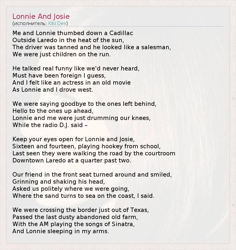 Я и Лонни стопнули Кадиллак Возле Ларедо в пору дикой жары. Смугляк-водитель, ну точно, как комми, Съехал для беглой детворы. Болтал с акцентом, необычно так! Видимо, был интурист. Я казалась актрисой себе в старом фильме. На Запад мы с Лонни неслись. Мы кричали "гудбай" тем, кто был позади, "Хелло" – тем, кто был впереди. Лонни и я били по коленям, Пока радио-диджей твердил: "Глядите в оба: Лонни и Джоси, Шестнадцати и четырнадц'ти лет. Филонов видели у храма фемиды, В третьем часу в Ларедо взяли их след". Наш друг обернулся, головой качнул, Подмигнул Лонни и мне. Спросил любезно: где остановка? "Где прибой и песок", – говорю в ответ. На техасской границе вдоль старой фермы Проезжали в пыли облаках Мы под ежевечерние песни Синатры, А Лонни спал в моих руках. * - Лонни (Lonnie) – сокращенный вариант мужского имени Алонсо (Alonzo); Джоси (Josie) – сокращенный вариант женского имени Жозефина (Josephine). Песня (1973) написана Элтоном Джоном (музыка) и Берни Топином (слова) специально для Кики Ди. Элтон Джон также участвует в записи в качестве пианиста и меллотрониста.