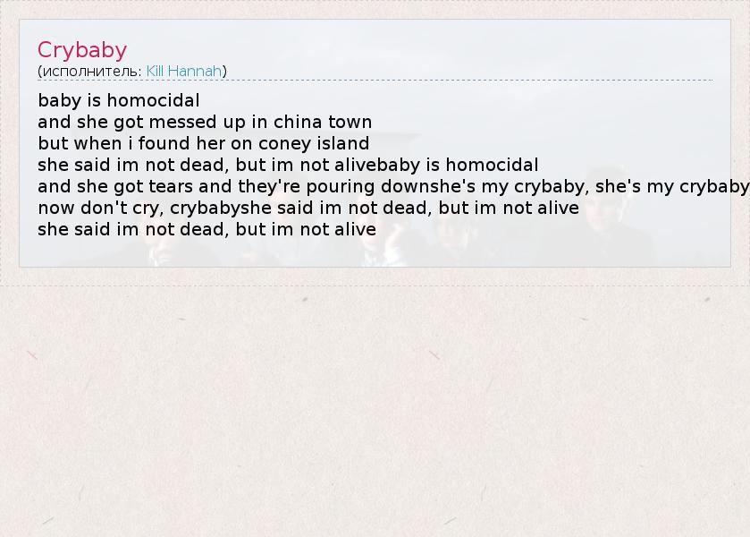 baby is homocidal and she got messed up in china town but when i found her on coney island she said im not dead, but im not alivebaby is homocidal and she got tears and they're pouring downshe's my crybaby, she's my crybaby now don't cry, crybabyshe said im not dead, but im not alive she said im not dead, but im not alive