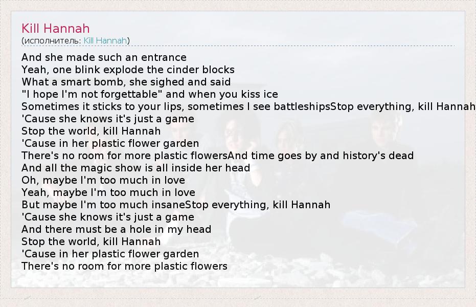 А как ты думаешь, о чем песня "Kill Hannah" ?