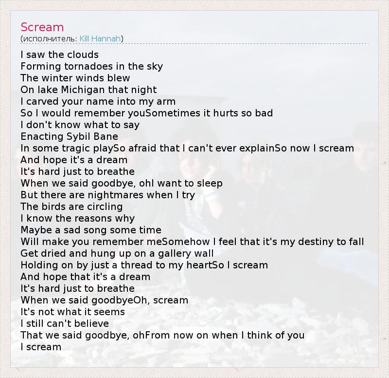 I saw the clouds Forming tornadoes in the sky The winter winds blew On lake Michigan that night I carved your name into my arm So I would remember youSometimes it hurts so bad I don't know what to say Enacting Sybil Bane In some tragic playSo afraid that I can't ever explainSo now I scream And hope it's a dream It's hard just to breathe When we said goodbye, ohI want to sleep But there are nightmares when I try The birds are circling I know the reasons why Maybe a sad song some time Will make you remember meSomehow I feel that it's my destiny to fall Get dried and hung up on a gallery wall Holding on by just a thread to my heartSo I scream And hope that it's a dream It's hard just to breathe When we said goodbyeOh, scream It's not what it seems I still can't believe That we said goodbye, ohFrom now on when I think of you I scream