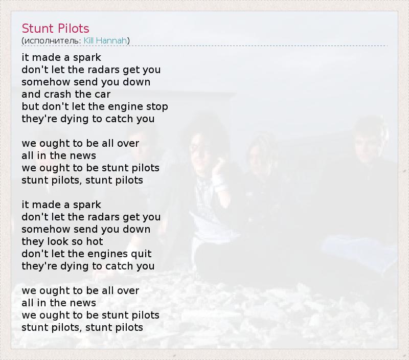it made a spark don't let the radars get you somehow send you down and crash the car but don't let the engine stop they're dying to catch you we ought to be all over all in the news we ought to be stunt pilots stunt pilots, stunt pilots it made a spark don't let the radars get you somehow send you down they look so hot don't let the engines quit they're dying to catch you we ought to be all over all in the news we ought to be stunt pilots stunt pilots, stunt pilots