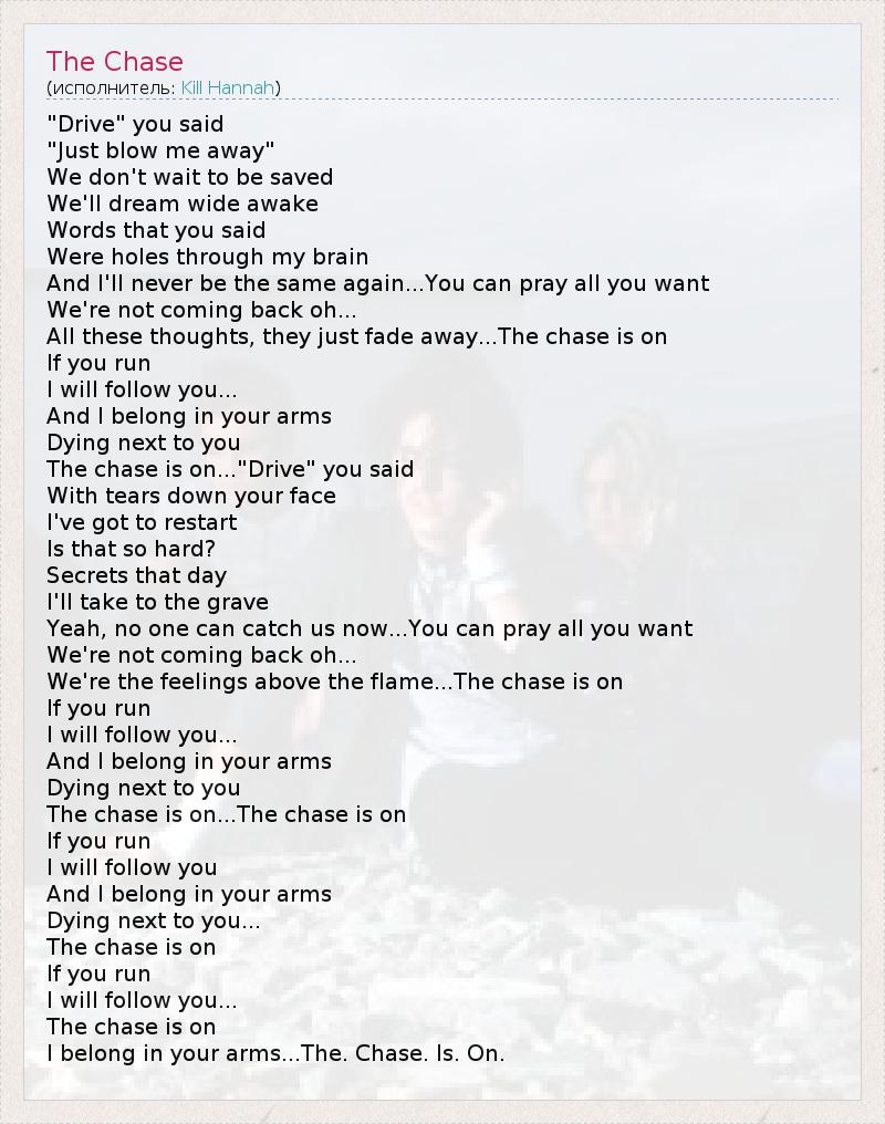 Это интересно:Kill Hannah – рок-группа из Чикаго, штат Иллинойс, в настоящее время подписавшая контракт с Atlantic Records. Kill Hannah была образована вокалистом и автором песен Мэтом Девайном в 1994 г. С 1996 по 2003 Kill Hannah независимо выпустили 8 синглов и номерных альбомов, все из которых были быстро распроданы многочисленными тиражами.Бывшая девушка вокалиста Мэта – тёзка группы. Они встретились в Государственном... продолжение