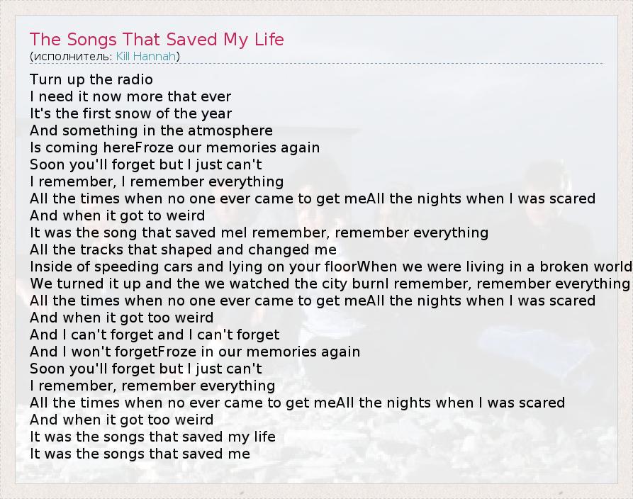 А как ты думаешь, о чем песня "The Songs That Saved My Life" ?