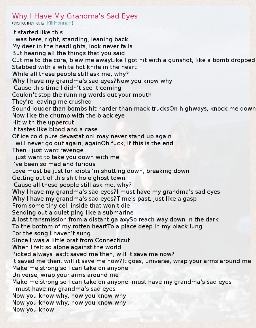 А как ты думаешь, о чем песня "Why I Have My Grandma's Sad Eyes" ?