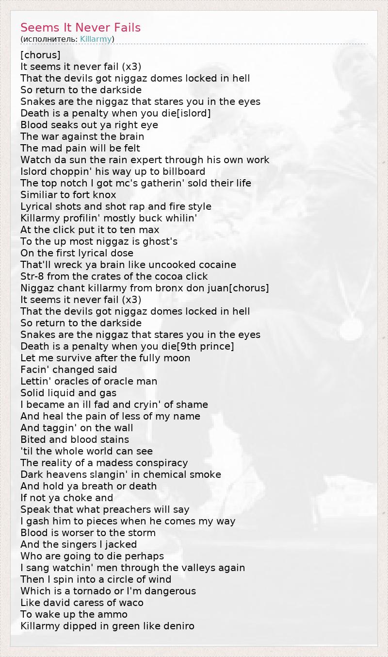[chorus] It seems it never fail (x3) That the devils got niggaz domes locked in hell So return to the darkside Snakes are the niggaz that stares you in the eyes Death is a penalty when you die[islord] Blood seaks out ya right eye The war against the brain The mad pain will be felt Watch da sun the rain expert through his own work Islord choppin' his way up to billboard The top notch I got mc's gatherin' sold their life Similiar to fort knox Lyrical shots and shot rap and fire style Killarmy profilin' mostly buck whilin' At the click put it to ten max To the up most niggaz is ghost's On the first lyrical dose That'll wreck ya brain like uncooked cocaine Str-8 from the crates of the cocoa click Niggaz chant killarmy from bronx don juan[chorus] It seems it never fail (x3) That the devils got niggaz domes locked in hell So return to the darkside Snakes are the niggaz that stares you in the eyes Death is a penalty when you die[9th prince] Let me survive after the fully moon Facin' changed said Lettin' oracles of oracle man Solid liquid and gas I became an ill fad and cryin' of shame And heal the pain of less of my name And taggin' on the wall Bited and blood stains 'til the whole world can see The reality of a madess conspiracy Dark heavens slangin' in chemical smoke And hold ya breath or death If not ya choke and Speak that what preachers will say I gash him to pieces when he comes my way Blood is worser to the storm And the singers I jacked Who are going to die perhaps I sang watchin' men through the valleys again Then I spin into a circle of wind Which is a tornado or I'm dangerous Like david caress of waco To wake up the ammo Killarmy dipped in green like deniro