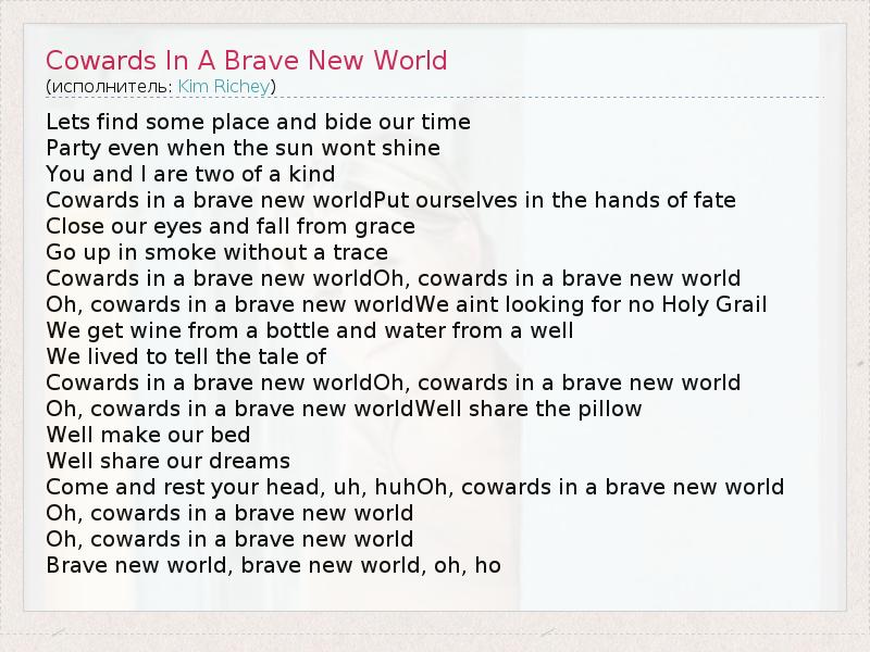 Lets find some place and bide our time Party even when the sun wont shine You and I are two of a kind Cowards in a brave new worldPut ourselves in the hands of fate Close our eyes and fall from grace Go up in smoke without a trace Cowards in a brave new worldOh, cowards in a brave new world Oh, cowards in a brave new worldWe aint looking for no Holy Grail We get wine from a bottle and water from a well We lived to tell the tale of Cowards in a brave new worldOh, cowards in a brave new world Oh, cowards in a brave new worldWell share the pillow Well make our bed Well share our dreams Come and rest your head, uh, huhOh, cowards in a brave new world Oh, cowards in a brave new world Oh, cowards in a brave new world Brave new world, brave new world, oh, ho