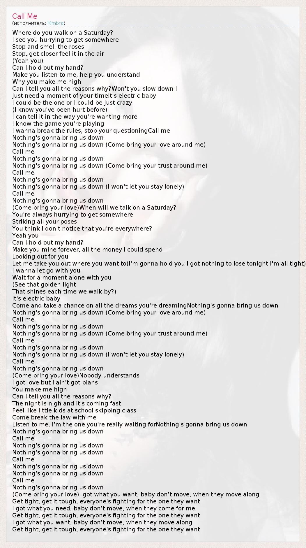 Это интересно:Кимбра Джонсон (род. 27 марта 1990 г.) - певица и автор песен родом из Новой Зеландии. В детстве Кимбра не очень увлекалась музыкой, но в возрасте 10 лет начала писать первые песни. В 12 лет отец подарил ей гитару и после нескольких лет занятий она начала выступать при этом, никогда не занимаясь вокалом. Учась в школе, она стала известна, как певица после участия в конкурсе национальных... продолжение