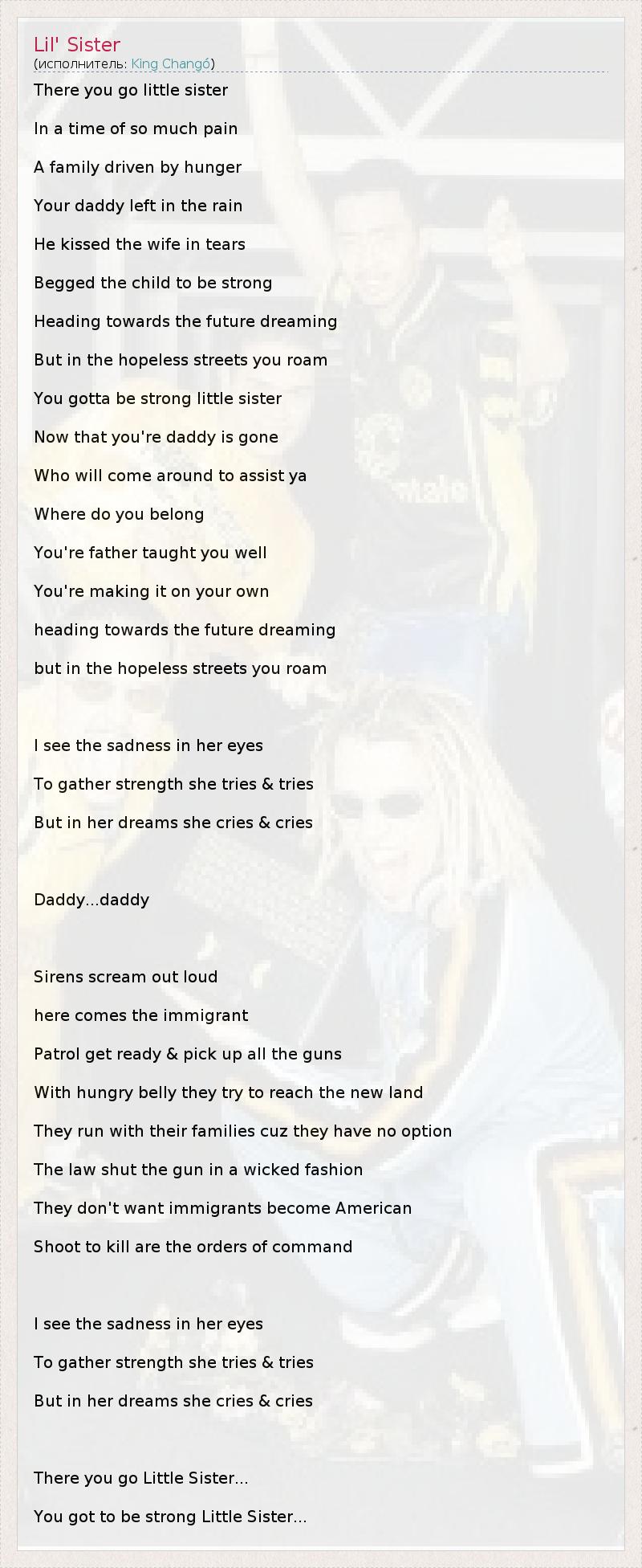 There you go little sister In a time of so much pain A family driven by hunger Your daddy left in the rain He kissed the wife in tears Begged the child to be strong Heading towards the future dreaming But in the hopeless streets you roam You gotta be strong little sister Now that you're daddy is gone Who will come around to assist ya Where do you belong You're father taught you well You're making it on your own heading towards the future dreaming but in the hopeless streets you roam I see the sadness in her eyes To gather strength she tries & tries But in her dreams she cries & cries Daddy...daddy Sirens scream out loud here comes the immigrant Patrol get ready & pick up all the guns With hungry belly they try to reach the new land They run with their families cuz they have no option The law shut the gun in a wicked fashion They don't want immigrants become American Shoot to kill are the orders of command I see the sadness in her eyes To gather strength she tries & tries But in her dreams she cries & cries There you go Little Sister... You got to be strong Little Sister...