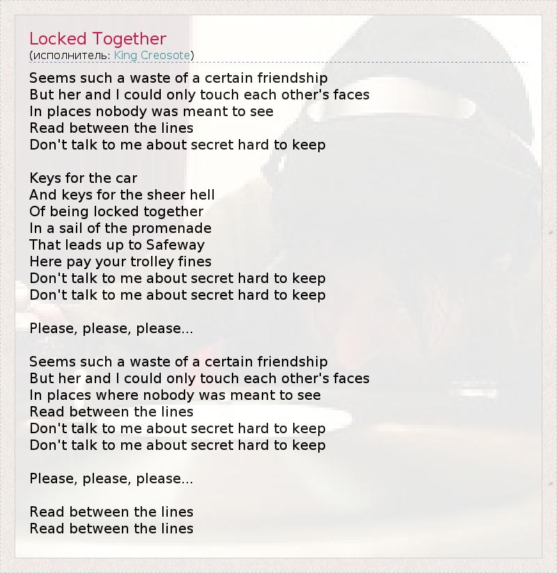 Seems such a waste of a certain friendship But her and I could only touch each other's faces In places nobody was meant to see Read between the lines Don't talk to me about secret hard to keep Keys for the car And keys for the sheer hell Of being locked together In a sail of the promenade That leads up to Safeway Here pay your trolley fines Don't talk to me about secret hard to keep Don't talk to me about secret hard to keep Please, please, please... Seems such a waste of a certain friendship But her and I could only touch each other's faces In places where nobody was meant to see Read between the lines Don't talk to me about secret hard to keep Don't talk to me about secret hard to keep Please, please, please... Read between the lines Read between the lines