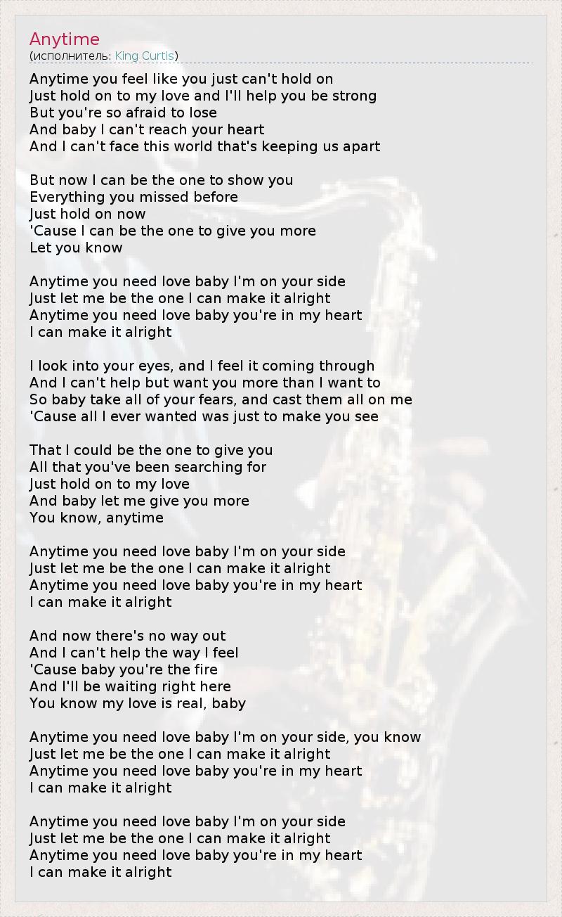 Каждый раз, когда чувствуешь, что не можешь больше держаться, Просто держись за мою любовь, и я помогу тебе быть сильным. Но ты так боишься проиграть, И, малыш, я не могу добраться до твоего сердца, И я не могу противостоять миру, который разделяет нас. Но сейчас я могу быть той, кто покажет тебе Всё то, что ты упускал раньше. Только держись, Потому что я могу быть той, кто даст тебе больше, Знай это. В любое время, когда тебе нужна любовь, малыш, я с тобой, Просто позволь мне быть той единственной, я сделаю всё правильно. В любое время, когда тебе нужна любовь, малыш, ты в моём сердце. Я сделаю всё правильно. Я смотрю в твои глаза, и чувствую это внутри, И я не могу удержаться, я хочу тебя ещё больше. Так что, малыш, отбрось все свои страхи, и положись на меня, Потому что все, чего я когда-либо хотела, – просто помочь тебе увидеть, Что я могла бы быть той, кто даст тебе Всё, чего ты искал. Просто держись за мою любовь, И, малыш, позволь мне дать тебе больше, Знаешь, в любое время. В любое время, когда тебе нужна любовь, малыш, я с тобой, Просто позволь мне быть той единственной, я сделаю всё правильно. В любое время, когда тебе нужна любовь, малыш, ты в моём сердце. Я сделаю всё правильно. И теперь у меня нет выхода. И я не могу противиться своим чувствам, Потому что, малыш, ты просто огонь. И я буду ждать здесь. Ты знаешь, моя любовь реальна, малыш. В любое время, когда тебе нужна любовь, малыш, я с тобой, Просто позволь мне быть той единственной, я сделаю всё правильно. В любое время, когда тебе нужна любовь, малыш, ты в моём сердце. Я сделаю всё правильно. В любое время, когда тебе нужна любовь, малыш, я с тобой, Просто позволь мне быть той единственной, я сделаю всё правильно. В любое время, когда тебе нужна любовь, малыш, ты в моём сердце. Я сделаю всё правильно.
