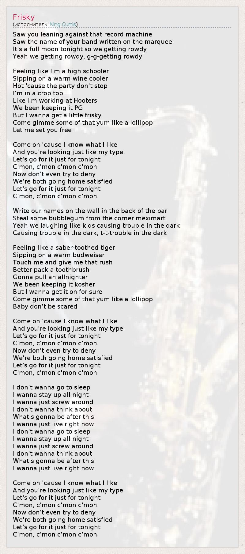 Saw you leaning against that record machine Saw the name of your band written on the marquee It's a full moon tonight so we getting rowdy Yeah we getting rowdy, g-g-getting rowdy Feeling like I'm a high schooler Sipping on a warm wine cooler Hot 'cause the party don't stop I'm in a crop top Like I'm working at Hooters We been keeping it PG But I wanna get a little frisky Come gimme some of that yum like a lollipop Let me set you free Come on 'cause I know what I like And you're looking just like my type Let's go for it just for tonight C'mon, c'mon c'mon c'mon Now don't even try to deny We're both going home satisfied Let's go for it just for tonight C'mon, c'mon c'mon c'mon Write our names on the wall in the back of the bar Steal some bubblegum from the corner meximart Yeah we laughing like kids causing trouble in the dark Causing trouble in the dark, t-t-trouble in the dark Feeling like a saber-toothed tiger Sipping on a warm budweiser Touch me and give me that rush Better pack a toothbrush Gonna pull an allnighter We been keeping it kosher But I wanna get it on for sure Come gimme some of that yum like a lollipop Baby don't be scared Come on 'cause I know what I like And you're looking just like my type Let's go for it just for tonight C'mon, c'mon c'mon c'mon Now don't even try to deny We're both going home satisfied Let's go for it just for tonight C'mon, c'mon c'mon c'mon I don't wanna go to sleep I wanna stay up all night I wanna just screw around I don't wanna think about What's gonna be after this I wanna just live right now I don't wanna go to sleep I wanna stay up all night I wanna just screw around I don't wanna think about What's gonna be after this I wanna just live right now Come on 'cause I know what I like And you're looking just like my type Let's go for it just for tonight C'mon, c'mon c'mon c'mon Now don't even try to deny We're both going home satisfied Let's go for it just for tonight C'mon, c'mon c'mon c'mon