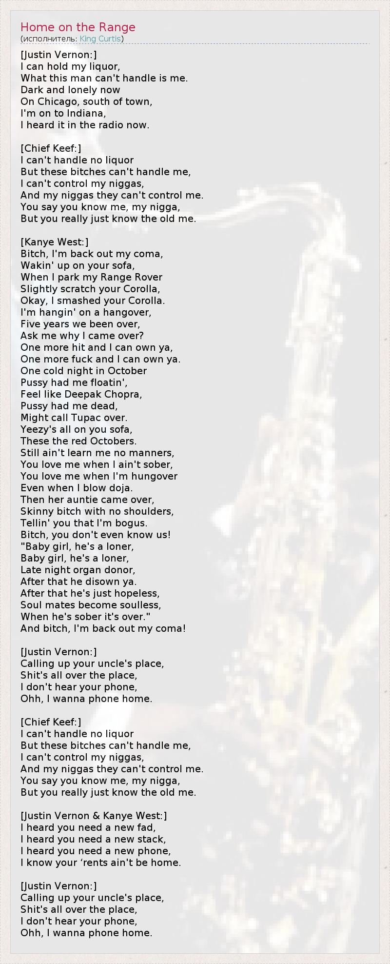 [Justin Vernon:] I can hold my liquor, What this man can't handle is me. Dark and lonely now On Chicago, south of town, I'm on to Indiana, I heard it in the radio now. [Chief Keef:] I can't handle no liquor But these bitches can't handle me, I can't control my niggas, And my niggas they can't control me. You say you know me, my nigga, But you really just know the old me. [Kanye West:] Bitch, I'm back out my coma, Wakin' up on your sofa, When I park my Range Rover Slightly scratch your Corolla, Okay, I smashed your Corolla. I'm hangin' on a hangover, Five years we been over, Ask me why I came over? One more hit and I can own ya, One more fuck and I can own ya. One cold night in October Pussy had me floatin', Feel like Deepak Chopra, Pussy had me dead, Might call Tupac over. Yeezy's all on you sofa, These the red Octobers. Still ain't learn me no manners, You love me when I ain't sober, You love me when I'm hungover Even when I blow doja. Then her auntie came over, Skinny bitch with no shoulders, Tellin' you that I'm bogus. Bitch, you don't even know us! "Baby girl, he's a loner, Baby girl, he's a loner, Late night organ donor, After that he disown ya. After that he's just hopeless, Soul mates become soulless, When he's sober it's over." And bitch, I'm back out my coma! [Justin Vernon:] Calling up your uncle's place, Shit's all over the place, I don't hear your phone, Ohh, I wanna phone home. [Chief Keef:] I can't handle no liquor But these bitches can't handle me, I can't control my niggas, And my niggas they can't control me. You say you know me, my nigga, But you really just know the old me. [Justin Vernon & Kanye West:] I heard you need a new fad, I heard you need a new stack, I heard you need a new phone, I know your ‘rents ain't be home. [Justin Vernon:] Calling up your uncle's place, Shit's all over the place, I don't hear your phone, Ohh, I wanna phone home.