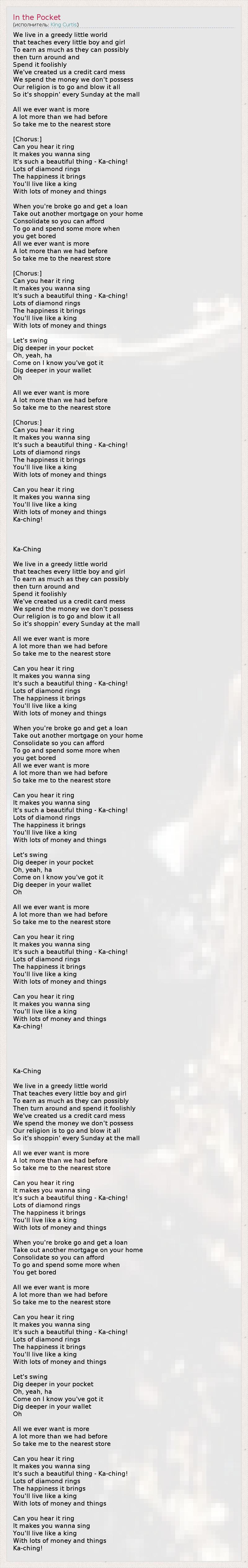 We live in a greedy little world that teaches every little boy and girl To earn as much as they can possibly then turn around and Spend it foolishly We've created us a credit card mess We spend the money we don't possess Our religion is to go and blow it all So it's shoppin' every Sunday at the mall All we ever want is more A lot more than we had before So take me to the nearest store [Chorus:] Can you hear it ring It makes you wanna sing It's such a beautiful thing - Ka-ching! Lots of diamond rings The happiness it brings You'll live like a king With lots of money and things When you're broke go and get a loan Take out another mortgage on your home Consolidate so you can afford To go and spend some more when you get bored All we ever want is more A lot more than we had before So take me to the nearest store [Chorus:] Can you hear it ring It makes you wanna sing It's such a beautiful thing - Ka-ching! Lots of diamond rings The happiness it brings You'll live like a king With lots of money and things Let's swing Dig deeper in your pocket Oh, yeah, ha Come on I know you've got it Dig deeper in your wallet Oh All we ever want is more A lot more than we had before So take me to the nearest store [Chorus:] Can you hear it ring It makes you wanna sing It's such a beautiful thing - Ka-ching! Lots of diamond rings The happiness it brings You'll live like a king With lots of money and things Can you hear it ring It makes you wanna sing You'll live like a king With lots of money and things Ka-ching! Ka-Ching We live in a greedy little world that teaches every little boy and girl To earn as much as they can possibly then turn around and Spend it foolishly We've created us a credit card mess We spend the money we don't possess Our religion is to go and blow it all So it's shoppin' every Sunday at the mall All we ever want is more A lot more than we had before So take me to the nearest store Can you hear it ring It makes you wanna sing It's such a beautiful thing - Ka-ching! Lots of diamond rings The happiness it brings You'll live like a king With lots of money and things When you're broke go and get a loan Take out another mortgage on your home Consolidate so you can afford To go and spend some more when you get bored All we ever want is more A lot more than we had before So take me to the nearest store Can you hear it ring It makes you wanna sing It's such a beautiful thing - Ka-ching! Lots of diamond rings The happiness it brings You'll live like a king With lots of money and things Let's swing Dig deeper in your pocket Oh, yeah, ha Come on I know you've got it Dig deeper in your wallet Oh All we ever want is more A lot more than we had before So take me to the nearest store Can you hear it ring It makes you wanna sing It's such a beautiful thing - Ka-ching! Lots of diamond rings The happiness it brings You'll live like a king With lots of money and things Can you hear it ring It makes you wanna sing You'll live like a king With lots of money and things Ka-ching! Ka-Ching We live in a greedy little world That teaches every little boy and girl To earn as much as they can possibly Then turn around and spend it foolishly We've created us a credit card mess We spend the money we don't possess Our religion is to go and blow it all So it's shoppin' every Sunday at the mall All we ever want is more A lot more than we had before So take me to the nearest store Can you hear it ring It makes you wanna sing It's such a beautiful thing - Ka-ching! Lots of diamond rings The happiness it brings You'll live like a king With lots of money and things When you're broke go and get a loan Take out another mortgage on your home Consolidate so you can afford To go and spend some more when You get bored All we ever want is more A lot more than we had before So take me to the nearest store Can you hear it ring It makes you wanna sing It's such a beautiful thing - Ka-ching! Lots of diamond rings The happiness it brings You'll live like a king With lots of money and things Let's swing Dig deeper in your pocket Oh, yeah, ha Come on I know you've got it Dig deeper in your wallet Oh All we ever want is more A lot more than we had before So take me to the nearest store Can you hear it ring It makes you wanna sing It's such a beautiful thing - Ka-ching! Lots of diamond rings The happiness it brings You'll live like a king With lots of money and things Can you hear it ring It makes you wanna sing You'll live like a king With lots of money and things Ka-ching!